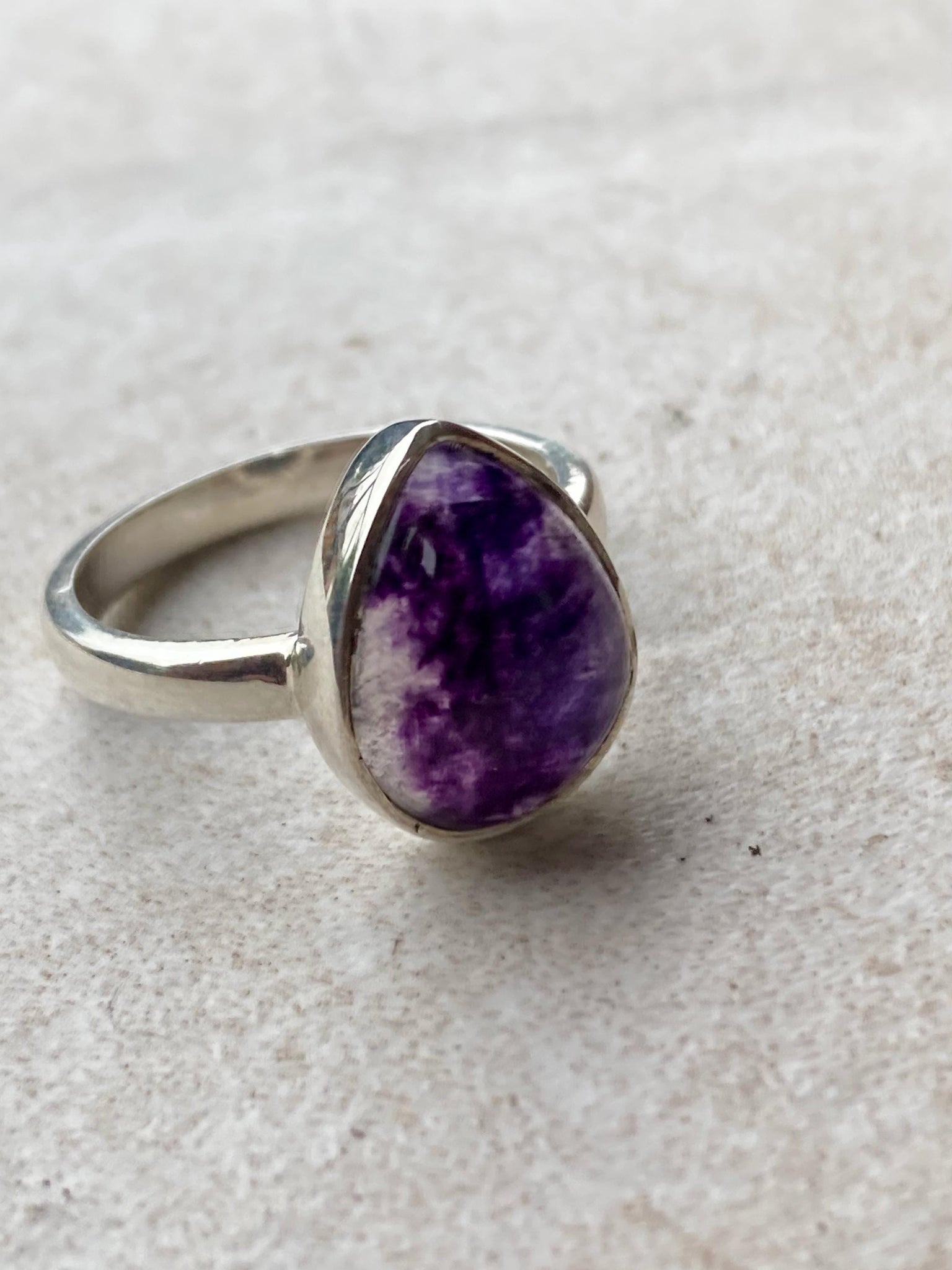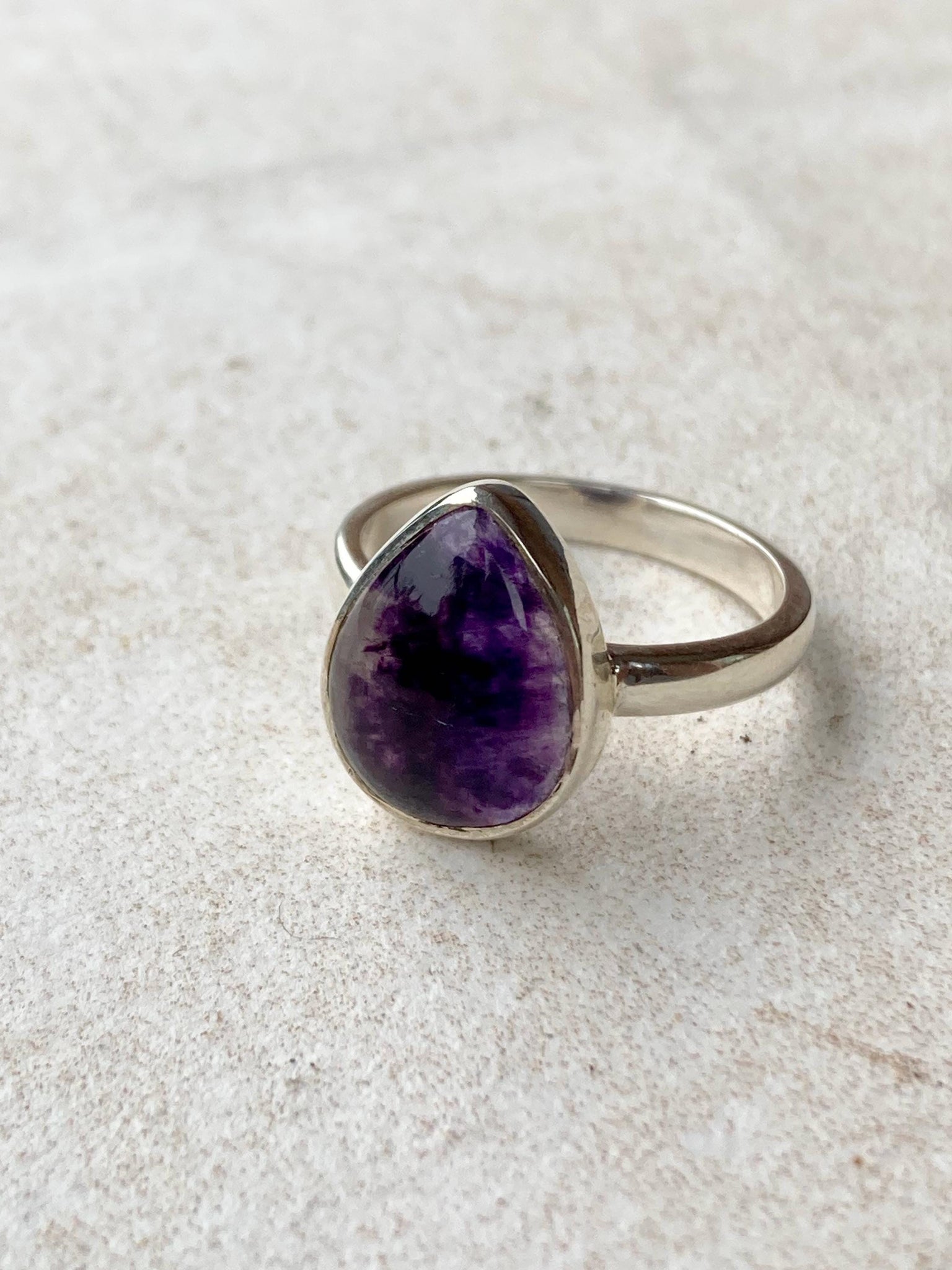 This Unique stone is a truly beautiful including bands of a vivid purple with a beautiful crystalline clarity and mysterious transparency making a truly beautiful ring. Pear-cut and set in a bezel. The band is of a simple yet classic design with a width of 25 mm.