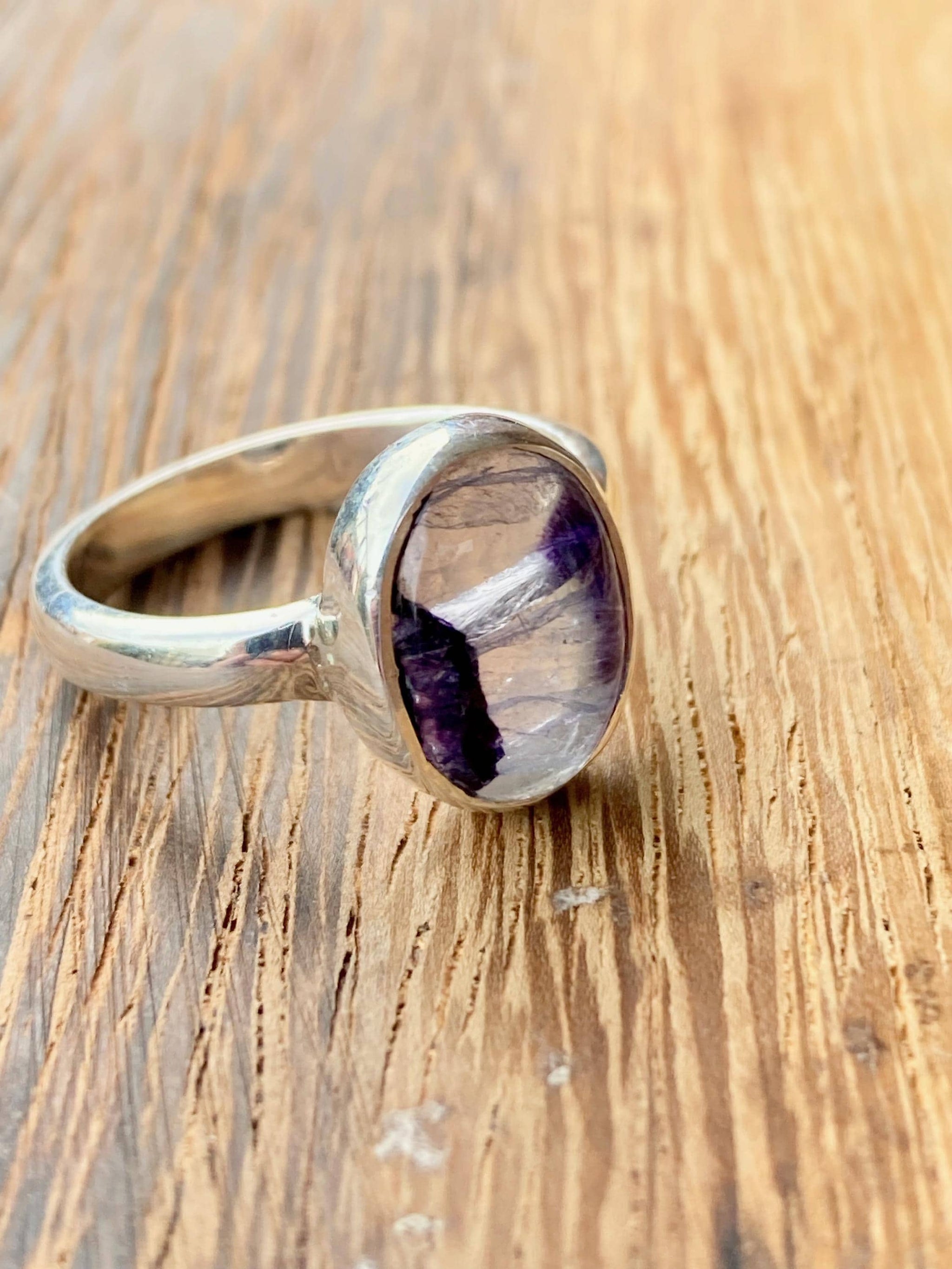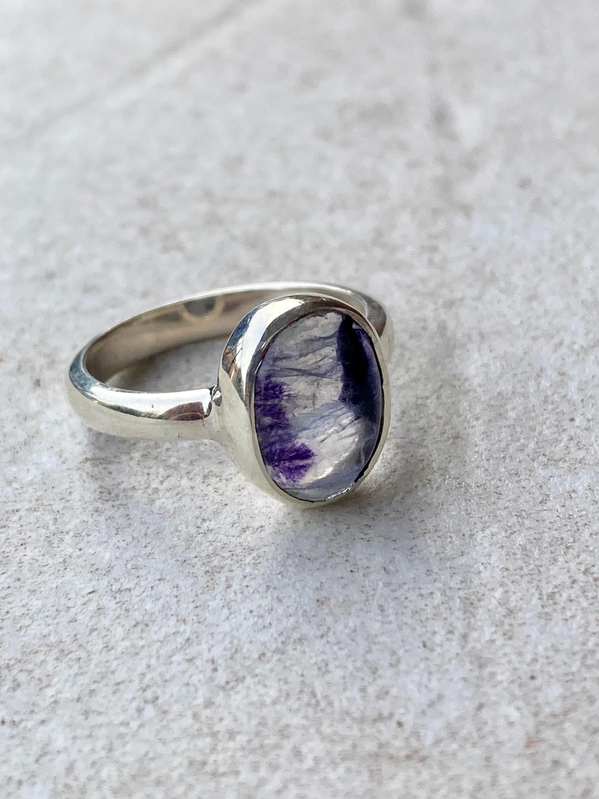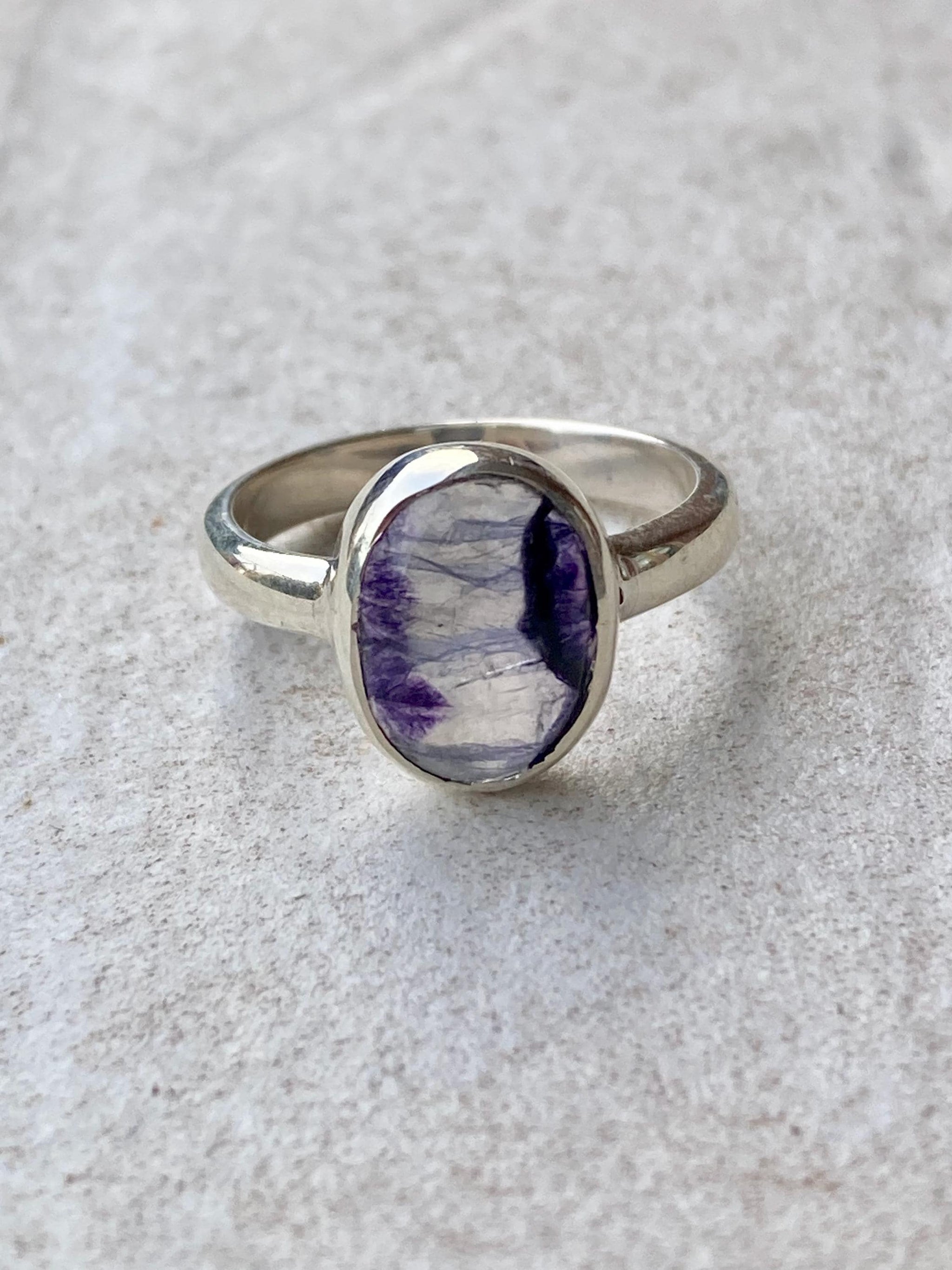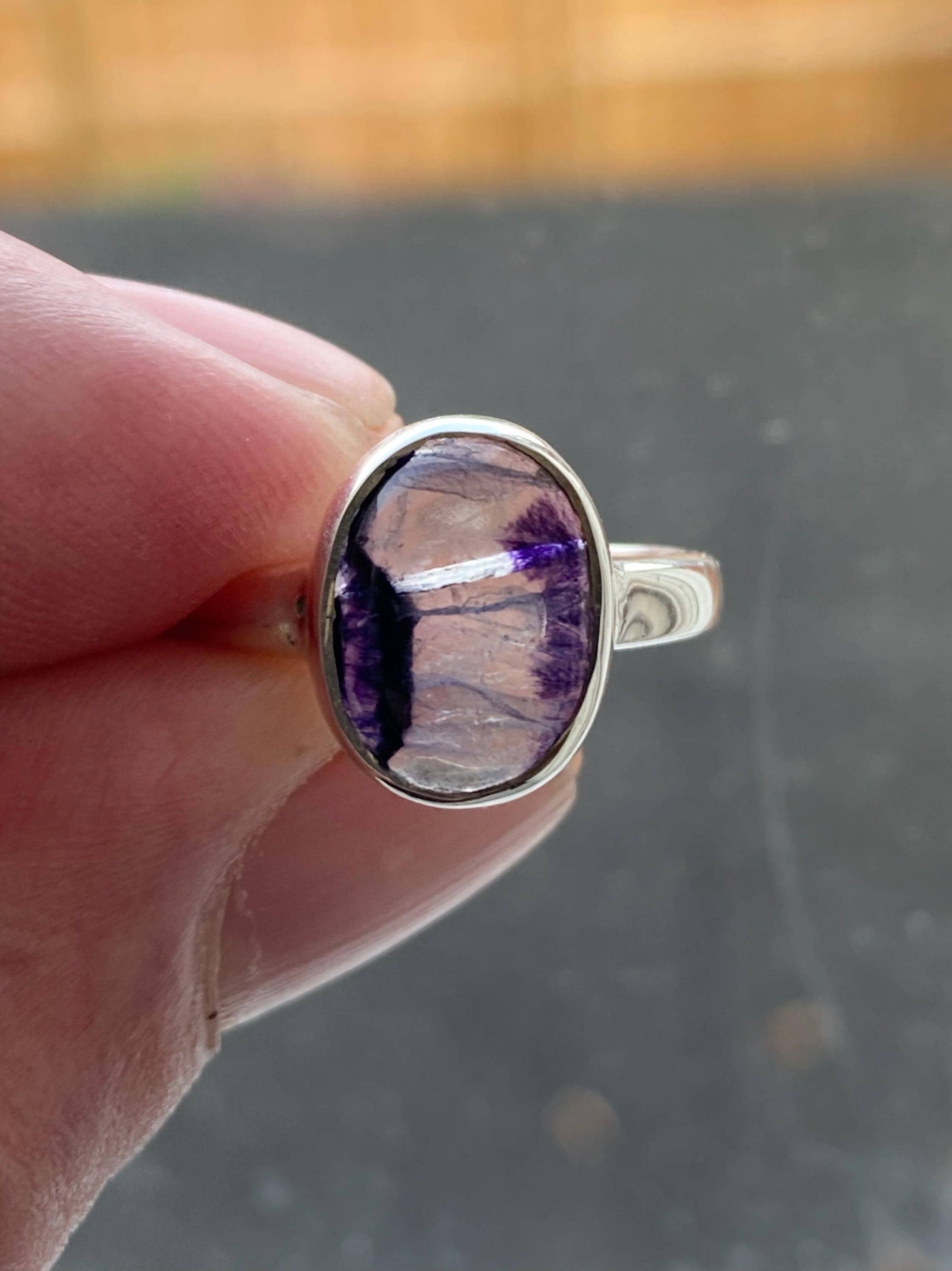 This Unique stone is a truly beautiful including bands of a vivid purple and a beautiful crystalline clarity and mysterious transparency making a truly beautiful ring. Oval-cut and set in a bezel. The band is of a simple yet classic design with a width of 2mm.