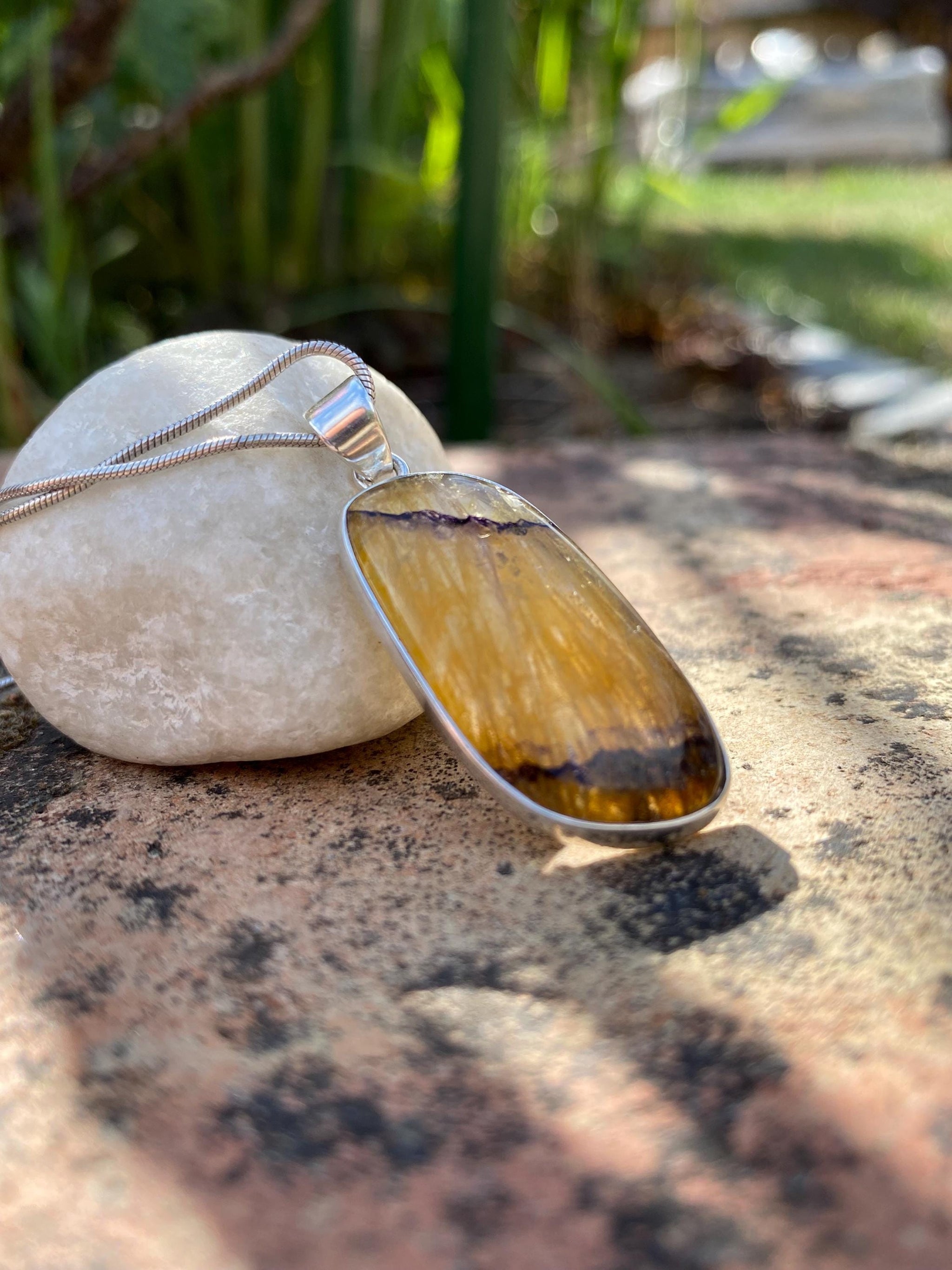 This unique stone makes a truly beautiful pendant with striking purplish blue striations throughout. Baguette-cut and set in the classic bezel