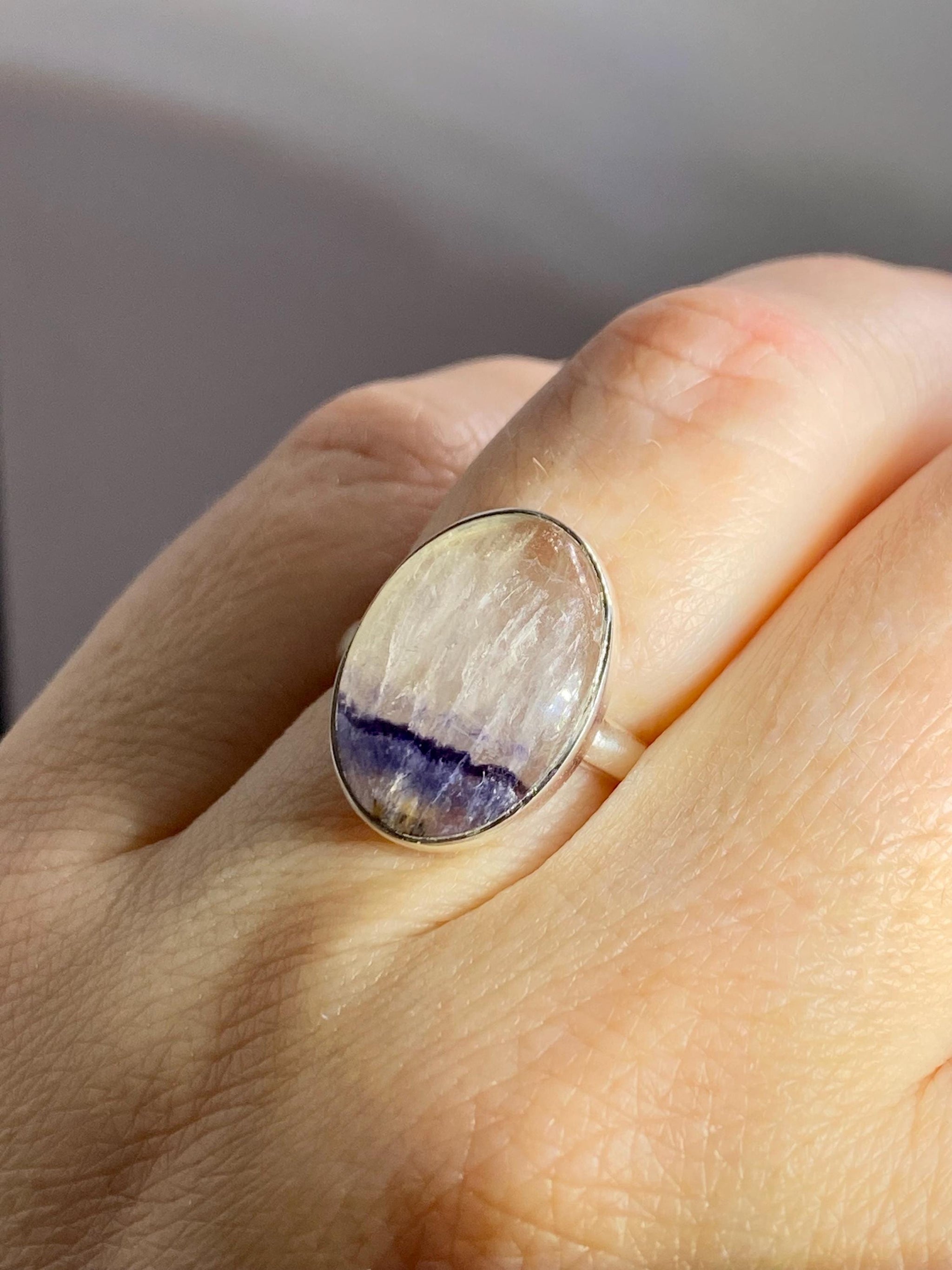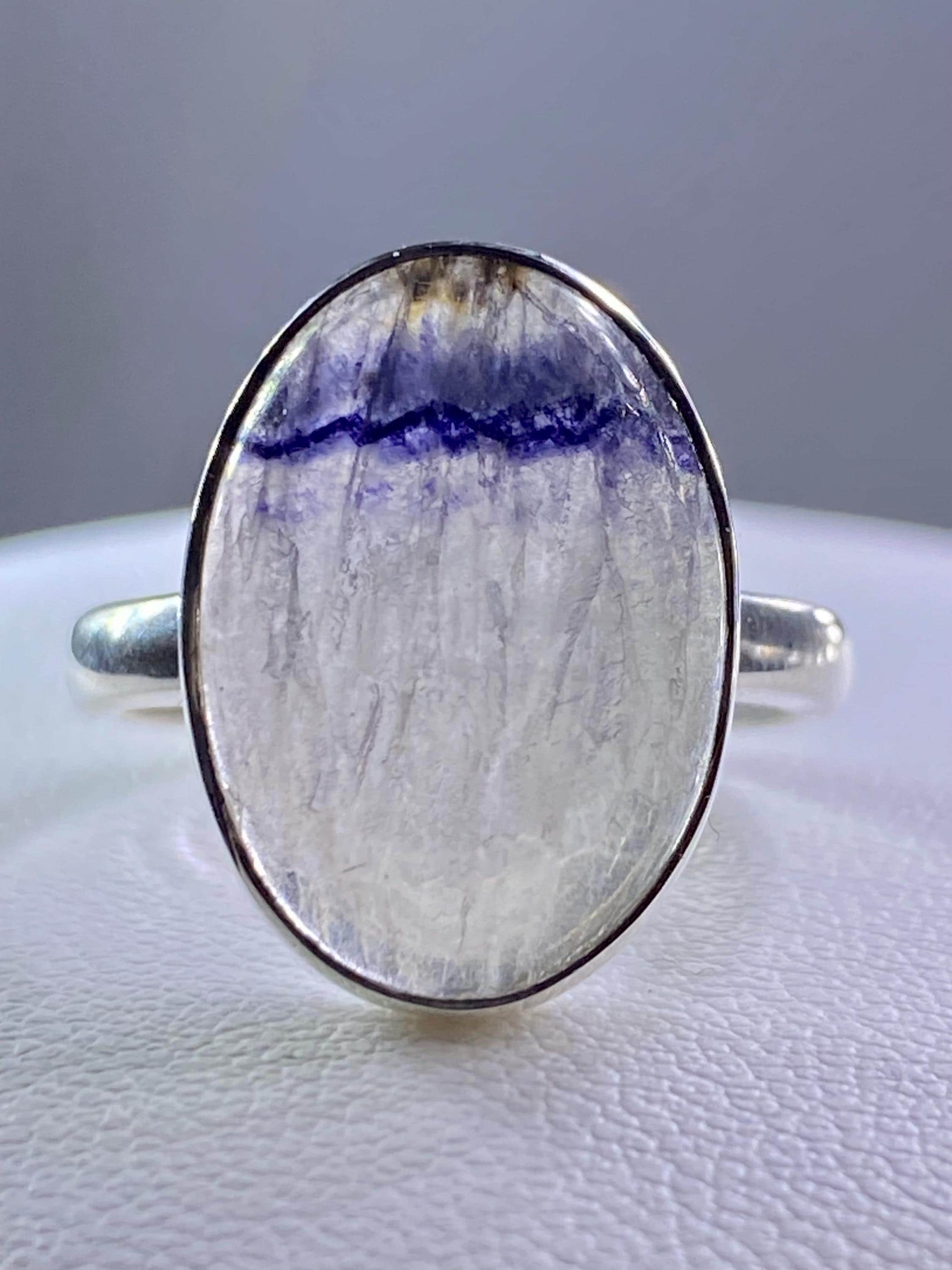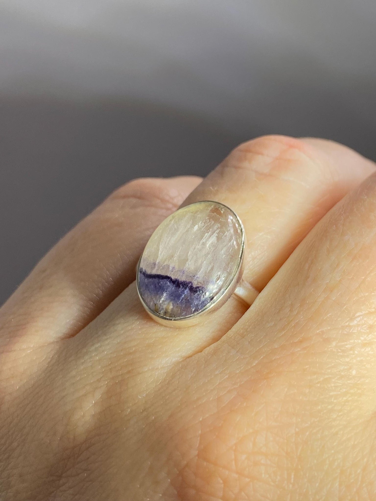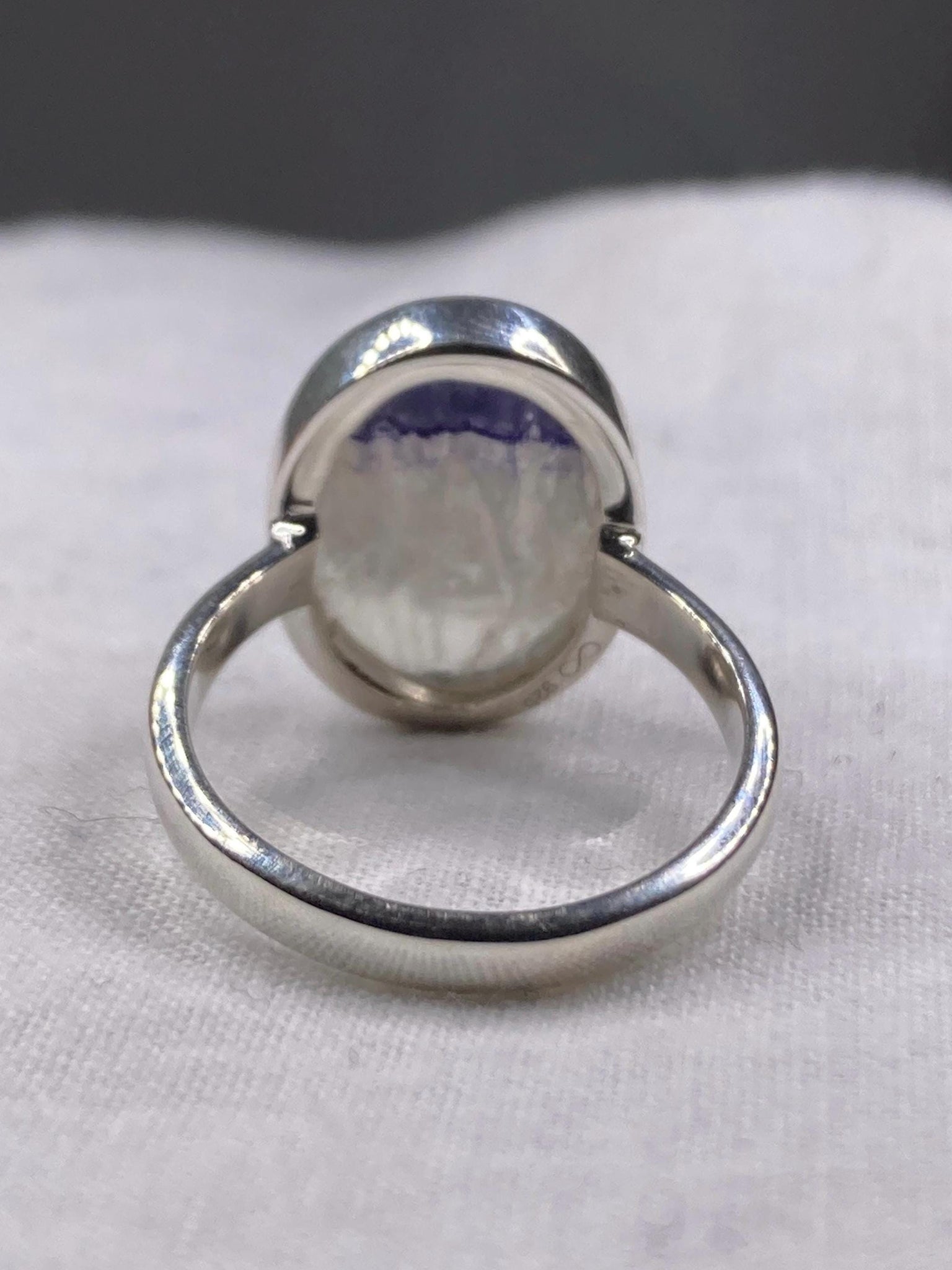 This Unique stone is a truly beautiful including bands of a vivid purple and a beautiful crystalline clarity and mysterious transparency making a truly beautiful ring. Oval-cut and set in a bezel. The band is of a simple yet classic design with a width of 2mm.