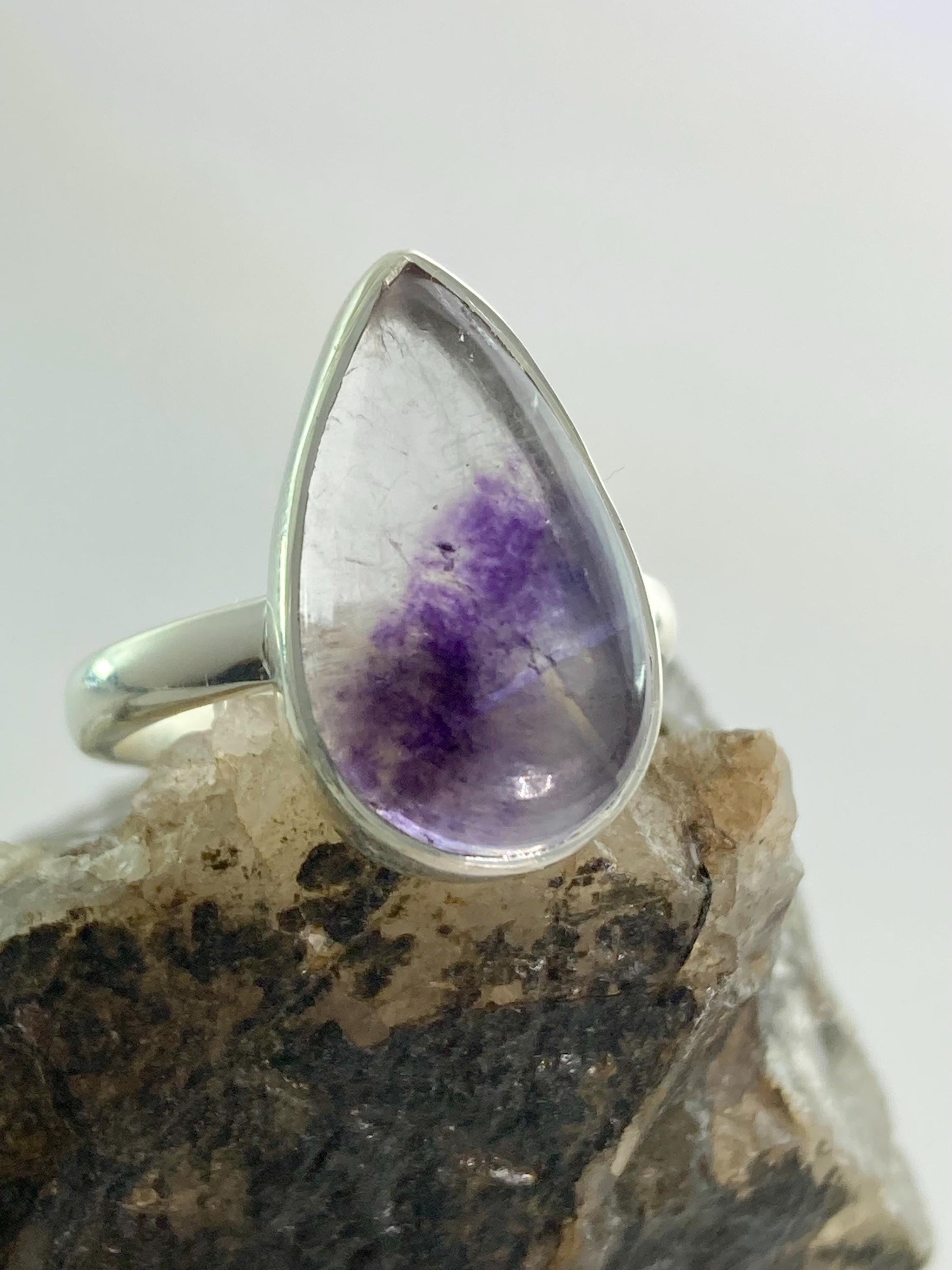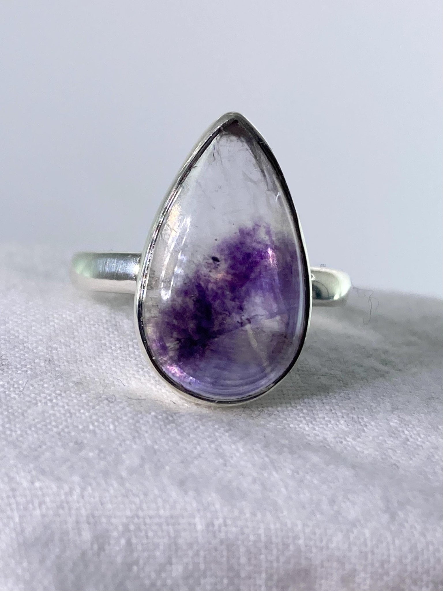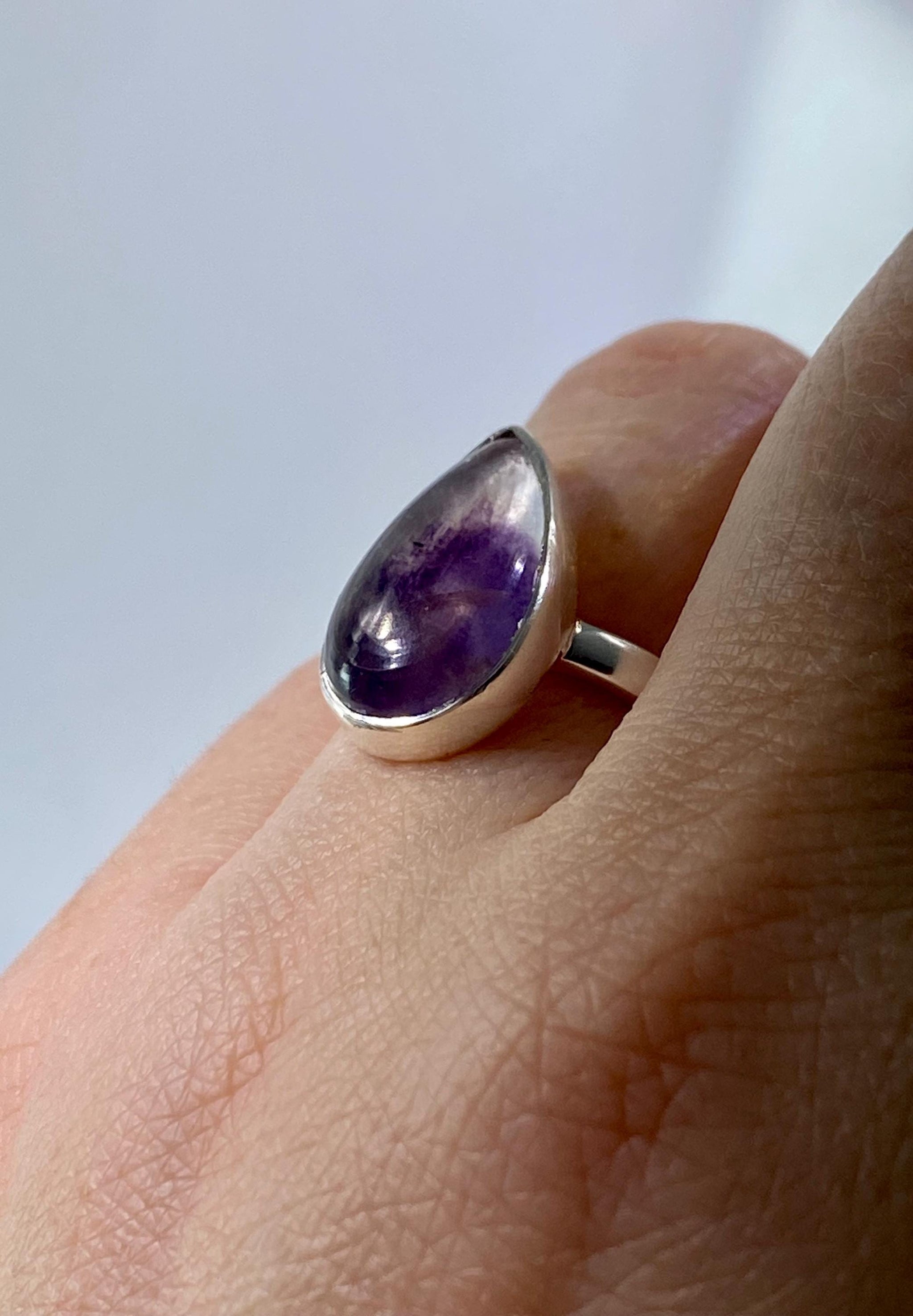 This Unique stone is a truly beautiful with bands of a purple-blue through to white colours, pear-cut and set in a bezel. The band is of a simple yet elegant design with a width of 2mm.