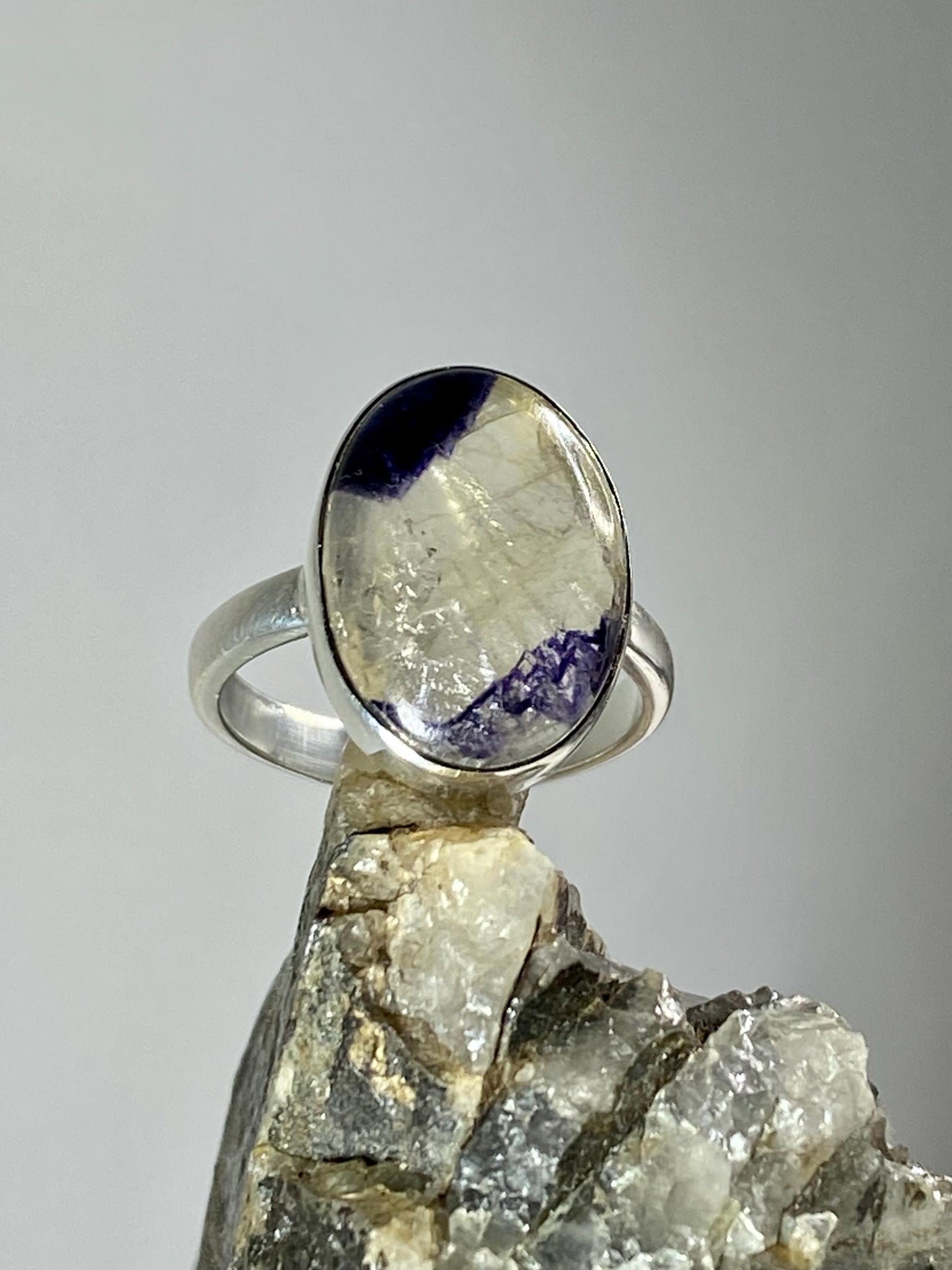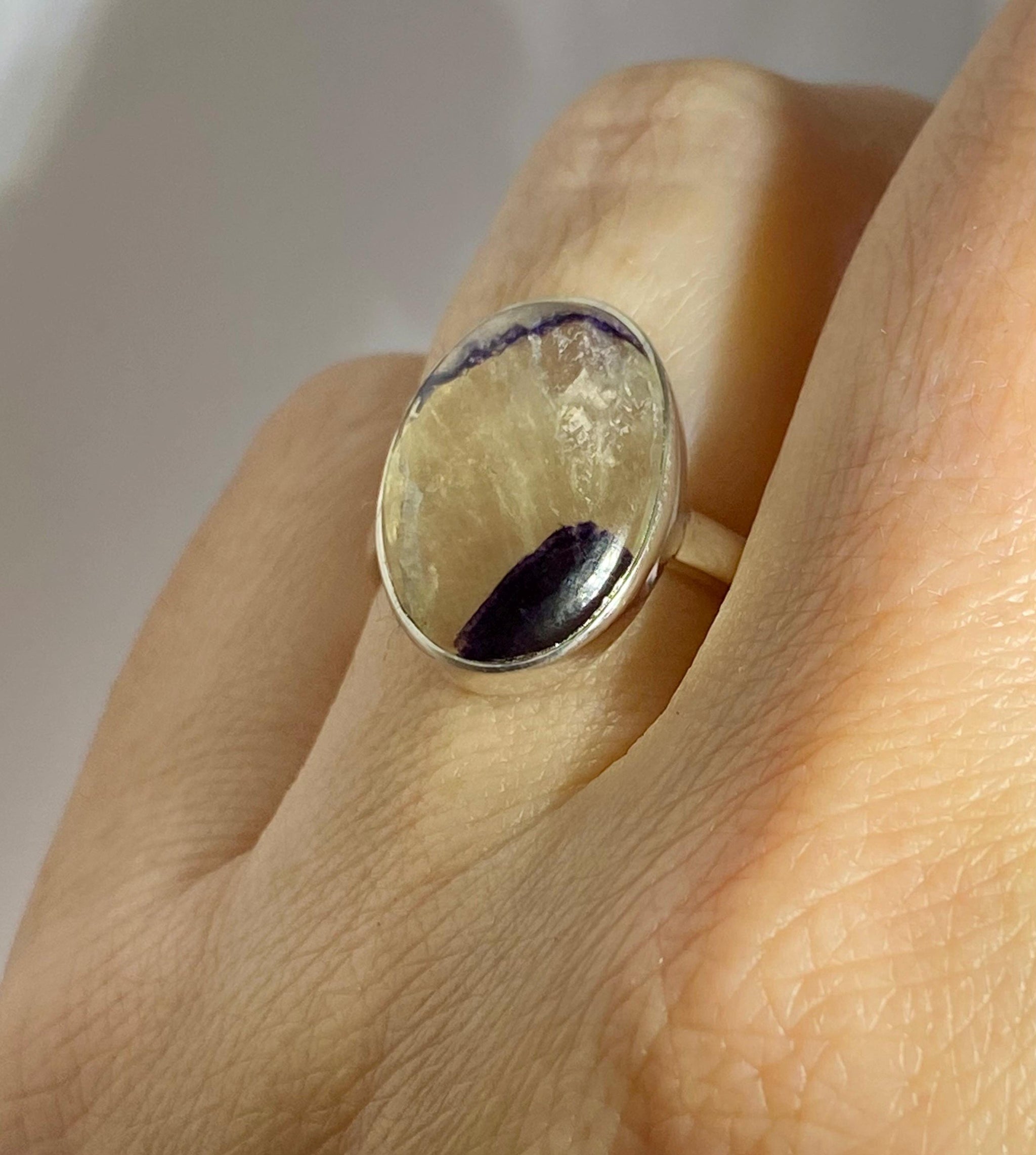 This Unique stone is a truly beautiful including bands of a vivid purple and a beautiful crystalline clarity and mysterious transparency making a truly beautiful ring. Oval-cut and set in a bezel. The band is of a simple yet classic design with a width of 2mm.