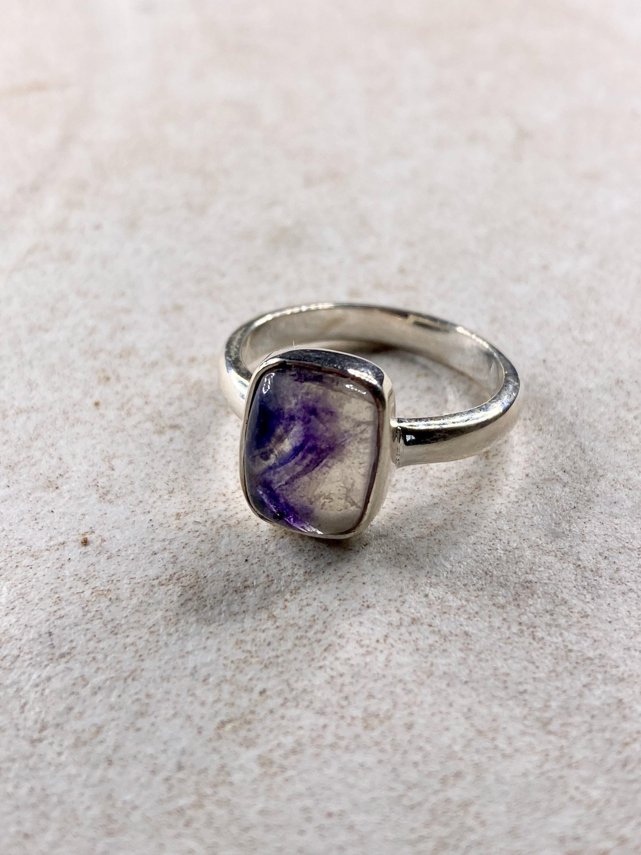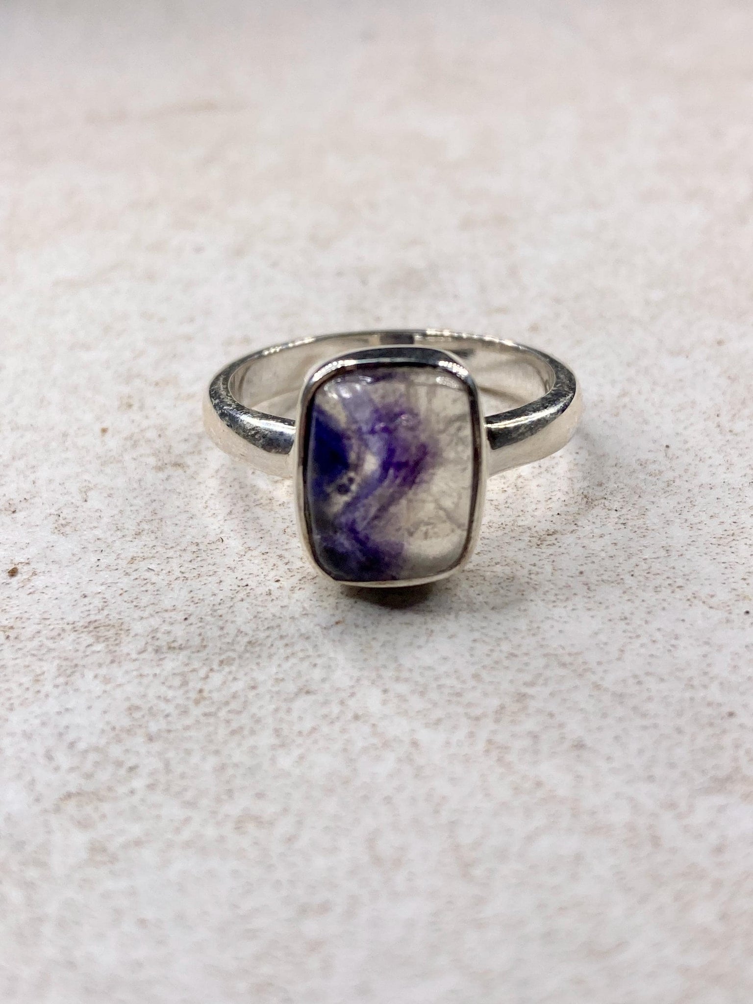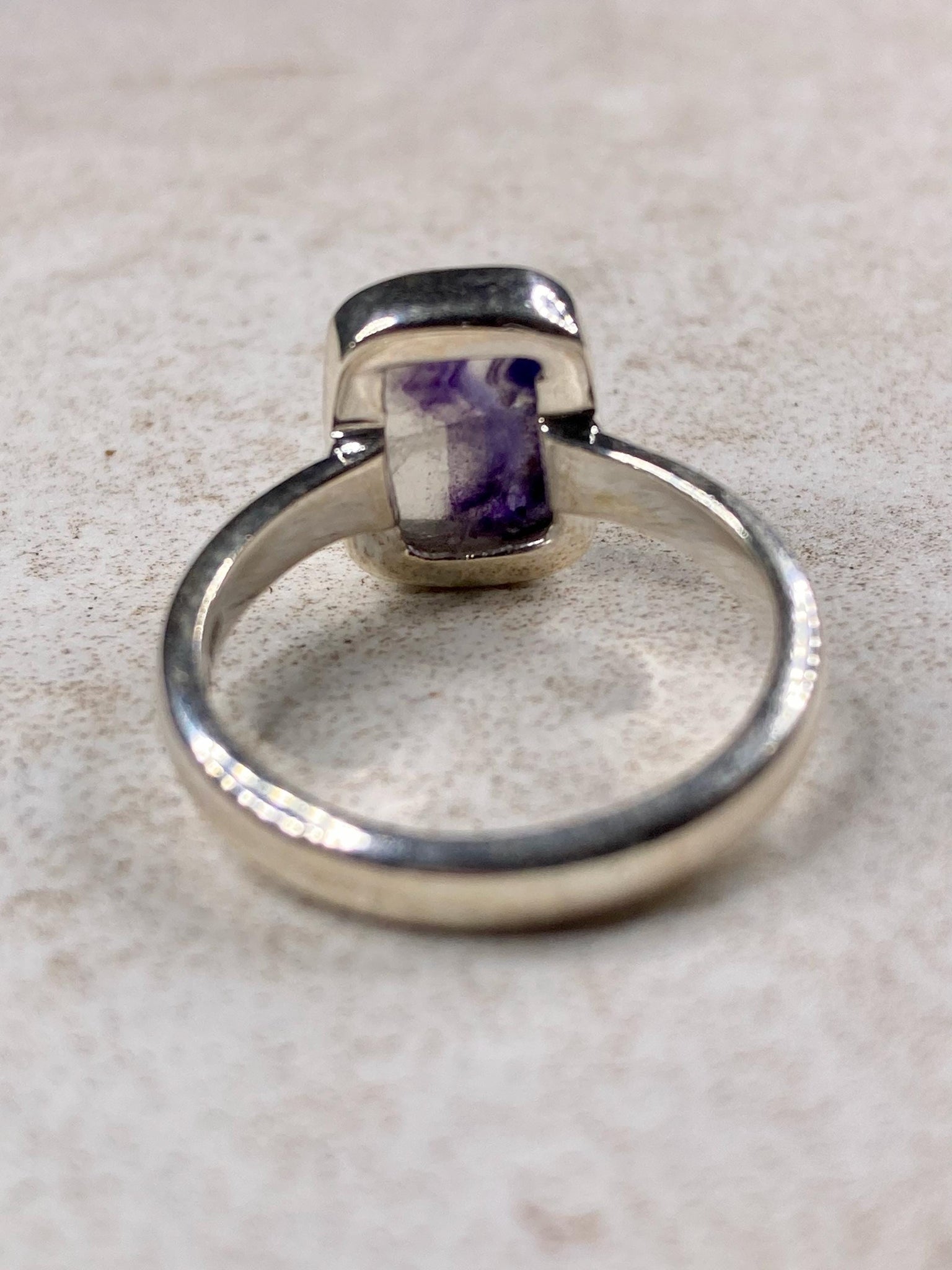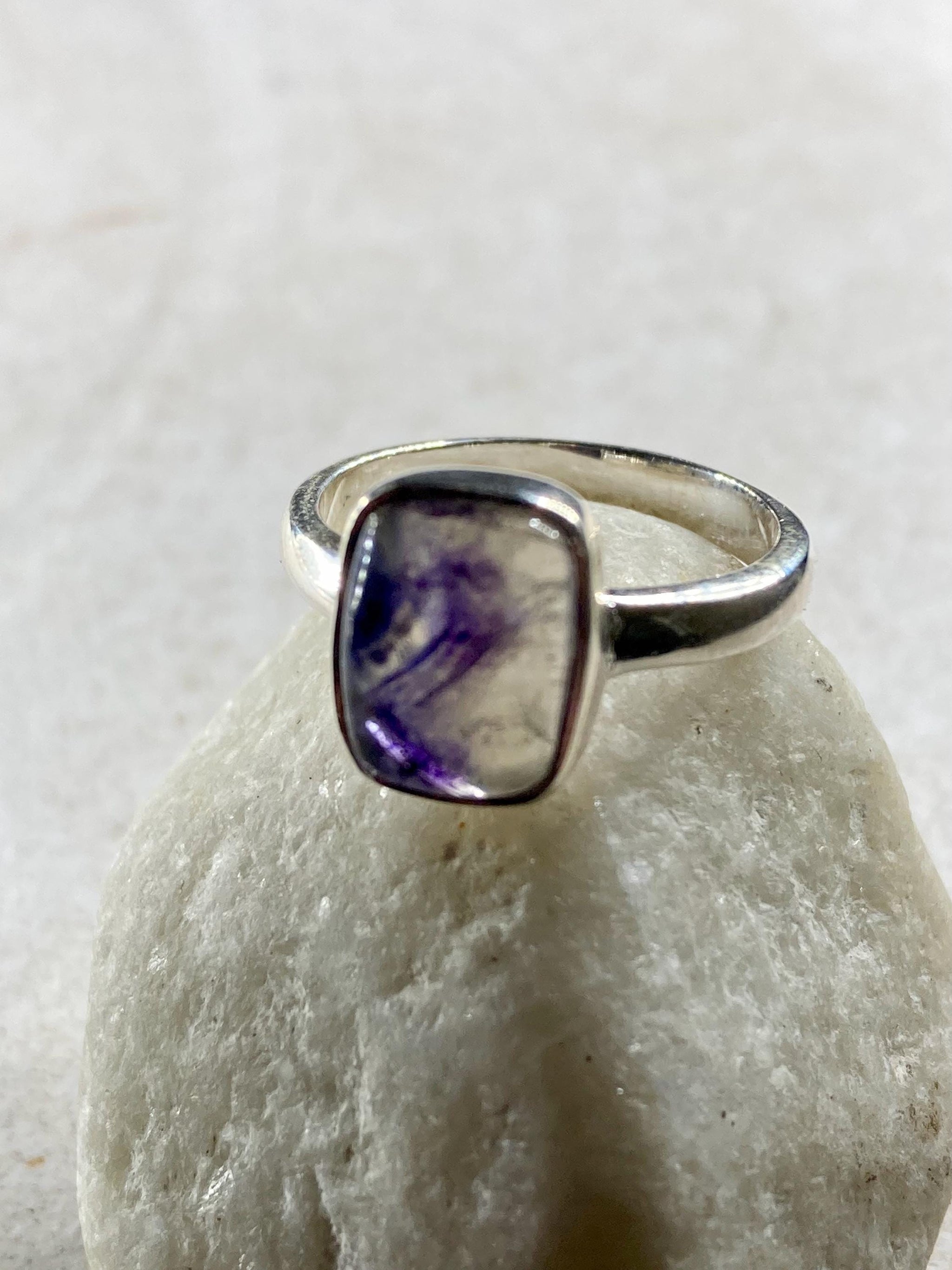 This unique stone is a truly beautiful including bands of a vivid purple and a beautiful crystalline clarity and mysterious transparency making a truly beautiful ring. Square cut and set in a bezel. The band is of a simple yet classic design with a width of 2mm.