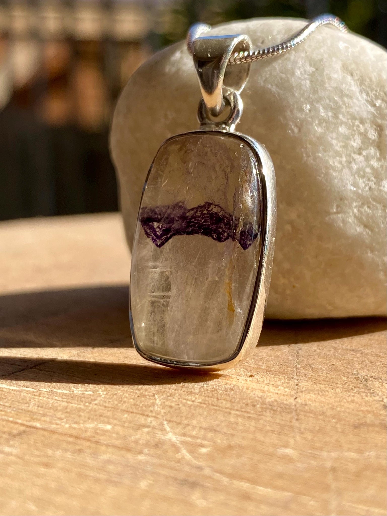 The stone is deep in vivid purple with a beautiful crystalline clarity and mysterious transparency, making a truly beautiful pendant which is baguette-cut and set in the classic bezel.