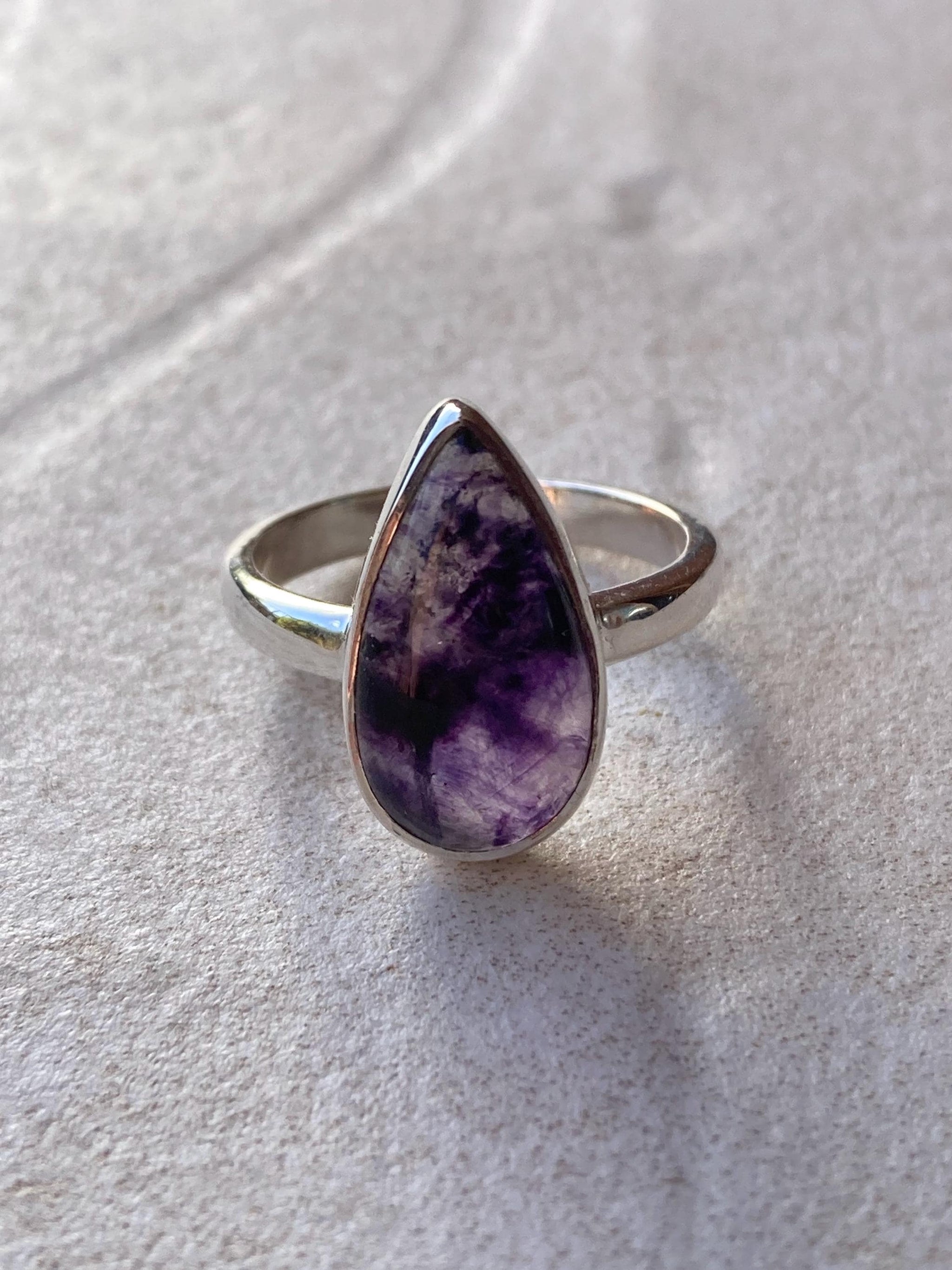 This Unique stone is a truly beautiful including bands of a vivid purple with a beautiful crystalline clarity and mysterious transparency making a truly beautiful ring. Pear-cut and set in a bezel. The band is of a simple yet classic design with a width of 25 mm.