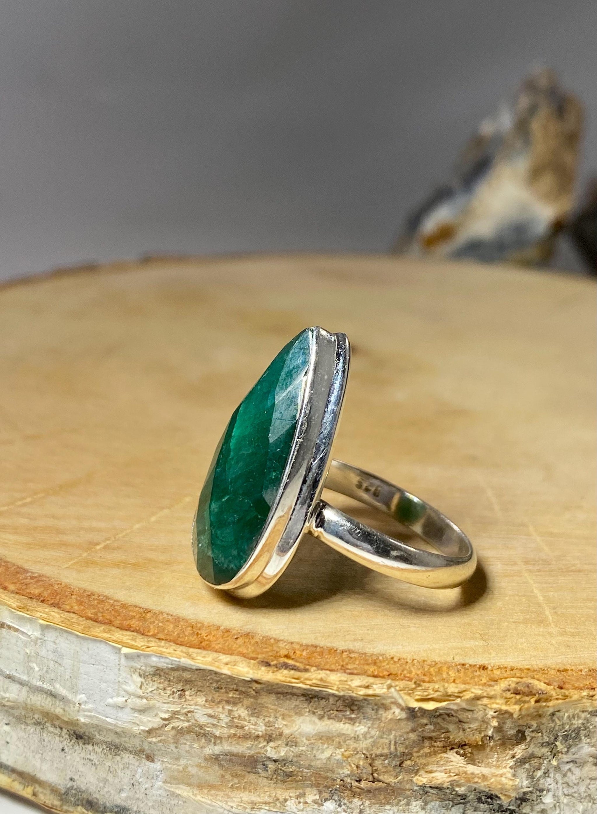 A beautifully sophisticated deep Green faceted raw Emerald and sterling silver ring.