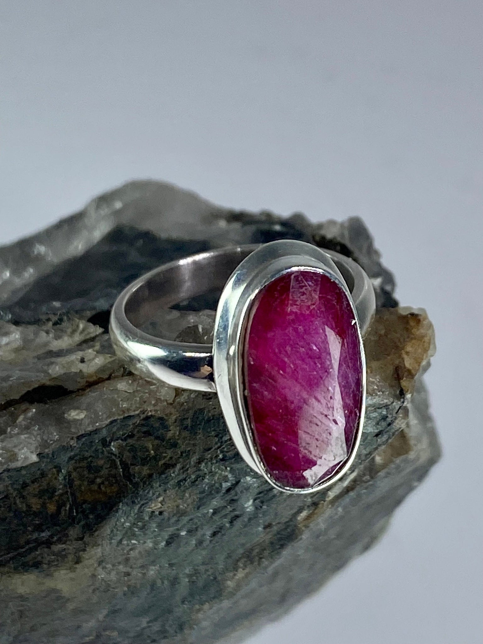 A beautifully sophisticated deep Purple Red faceted raw Ruby and sterling silver ring.