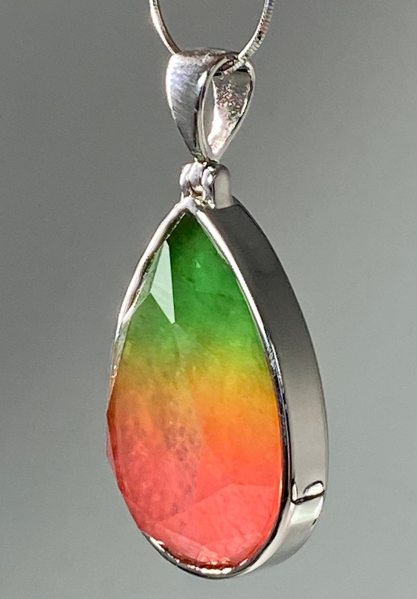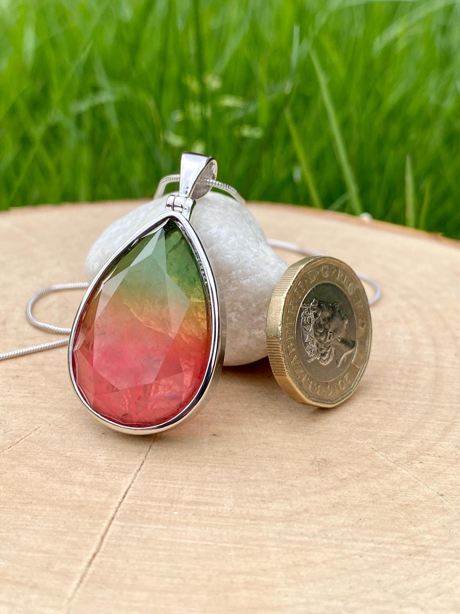 A beautifully eye-catching bi-coloured pink and green Watermelon Tourmaline Crystal 925 Sterling silver pendant.