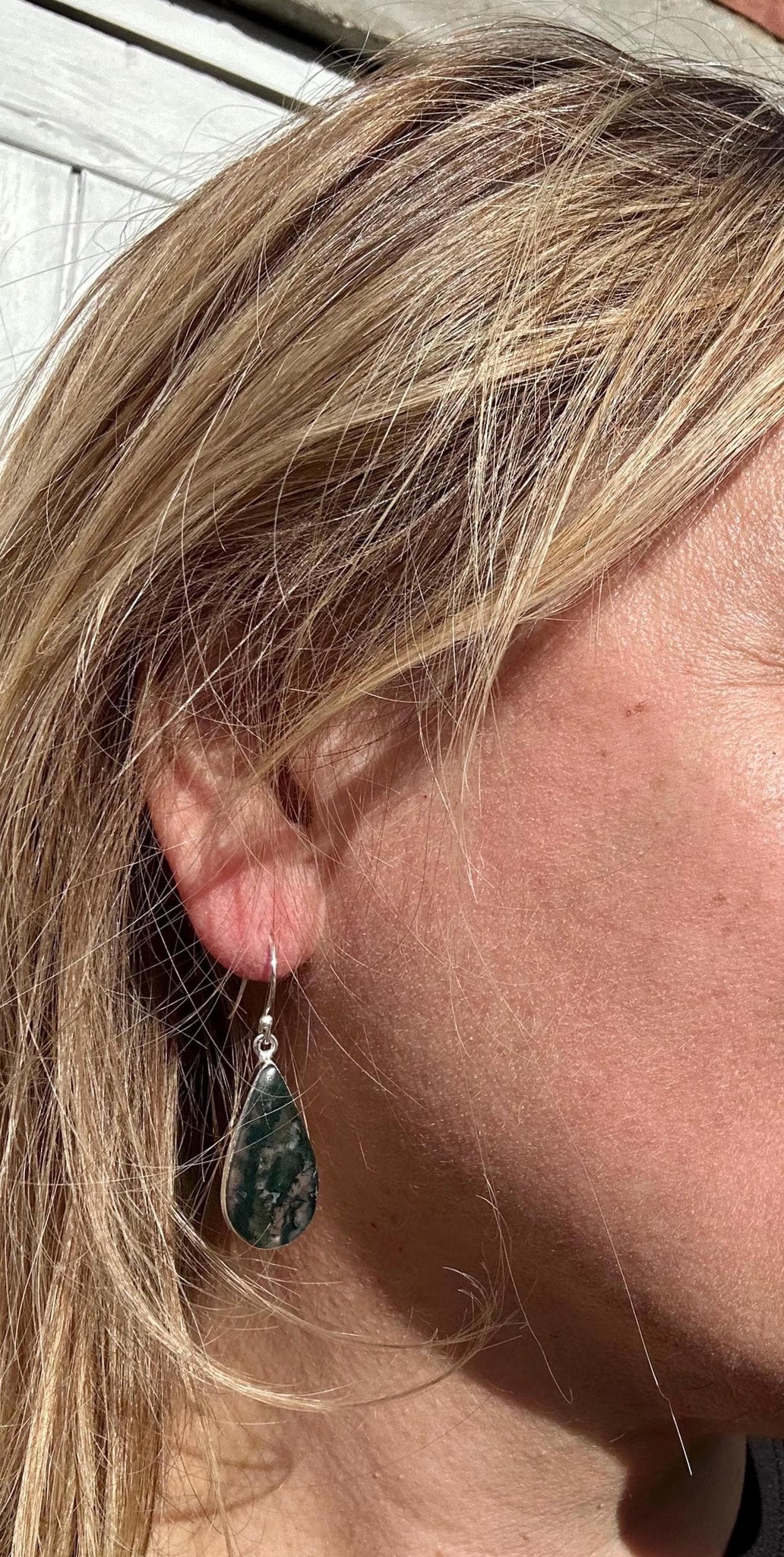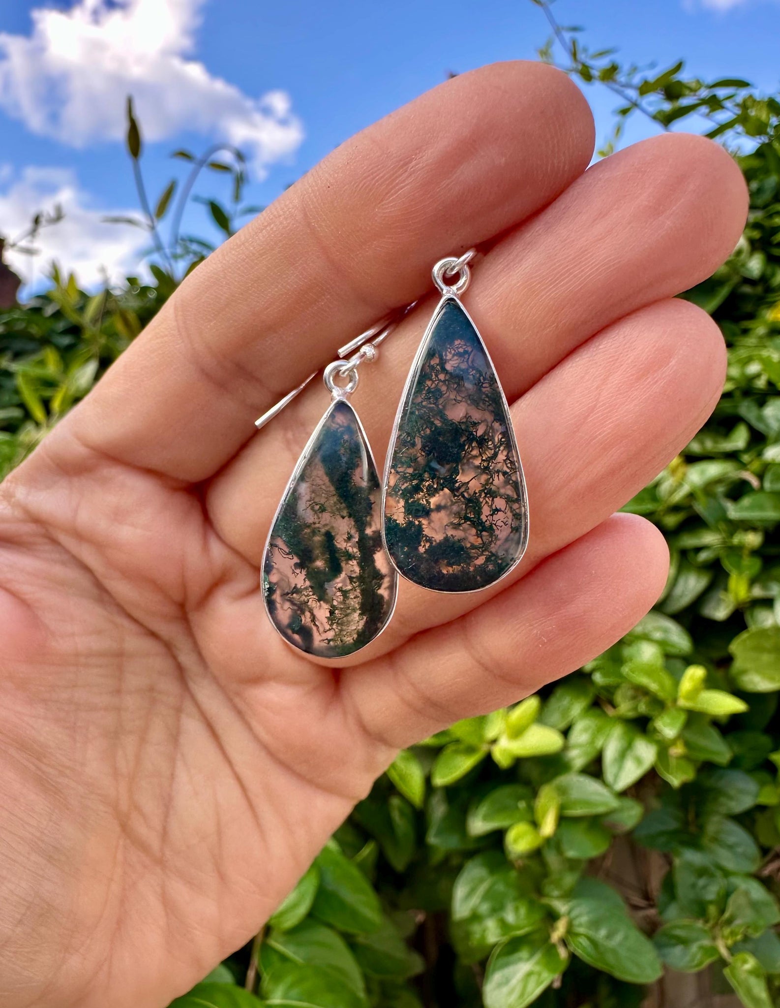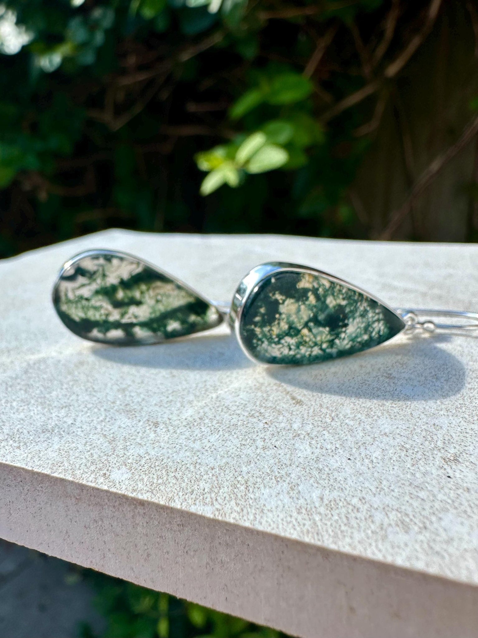 Moss Agate Dangle Earrings, Large Teardrop 26mm x 14mm Sterling Silver, Handmade UK gift