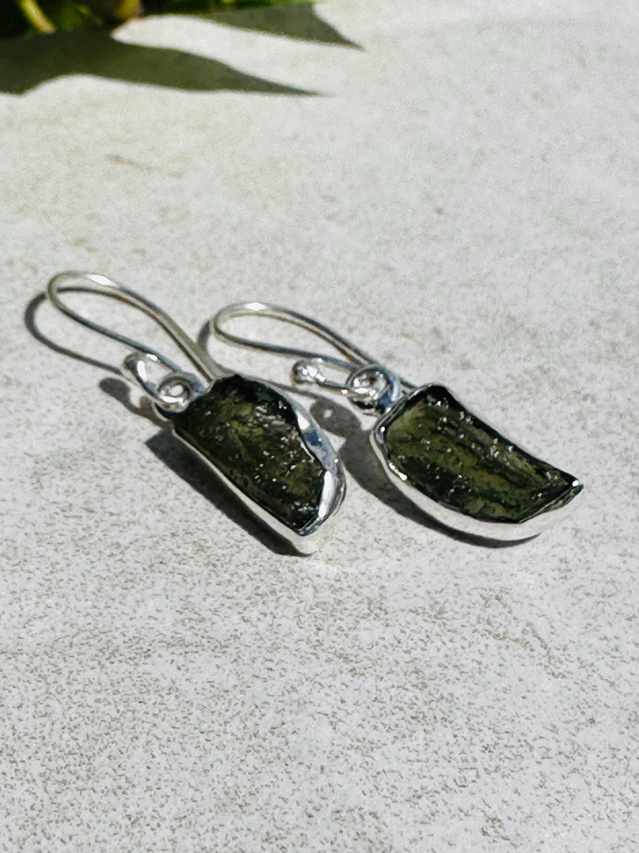 Natural Moldavite Dangle Earrings, Sterling Silver Uncut 14mm x 7mm, Handmade UK