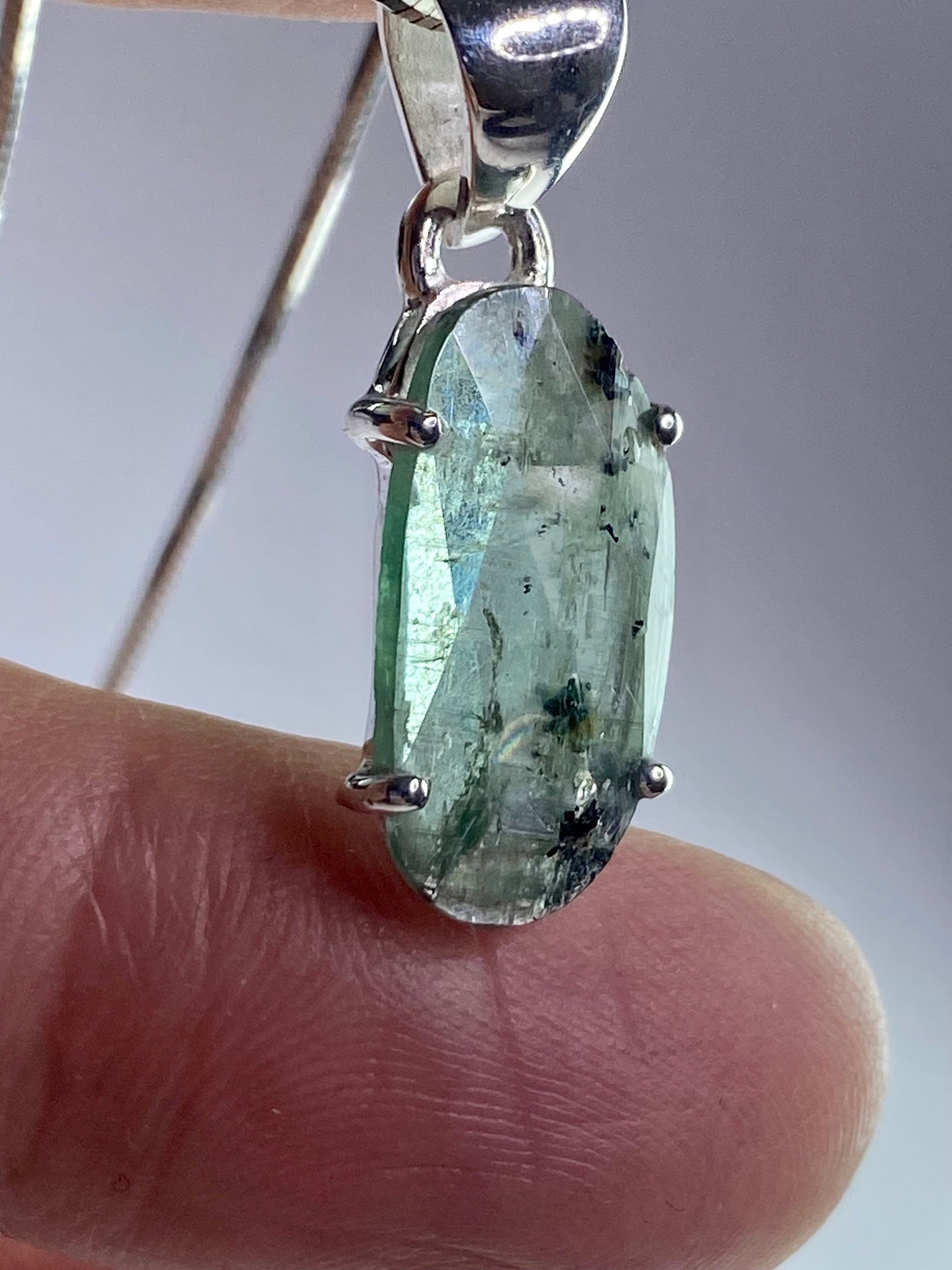 Genuine Brazilian Moss Teal Kyanite gemstone piece set in solid sterling silver 4 prongs. This stone is a great example of fine Moss Teal Kyanite. A really gorgeous gemstone piece with a slightly pearly lustre.
