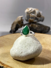 A beautifully sophisticated deep green raw Emerald and sterling silver ring.
