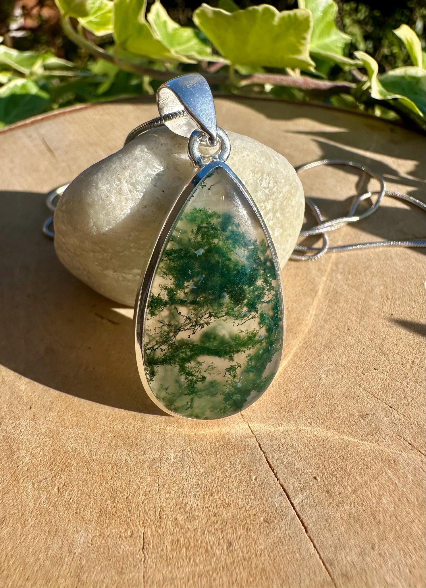 An exquisitely high quality Moss Agate and 925 silver pendant. Pear-cut and set in the classic 925 Sterling Silver bezel.
