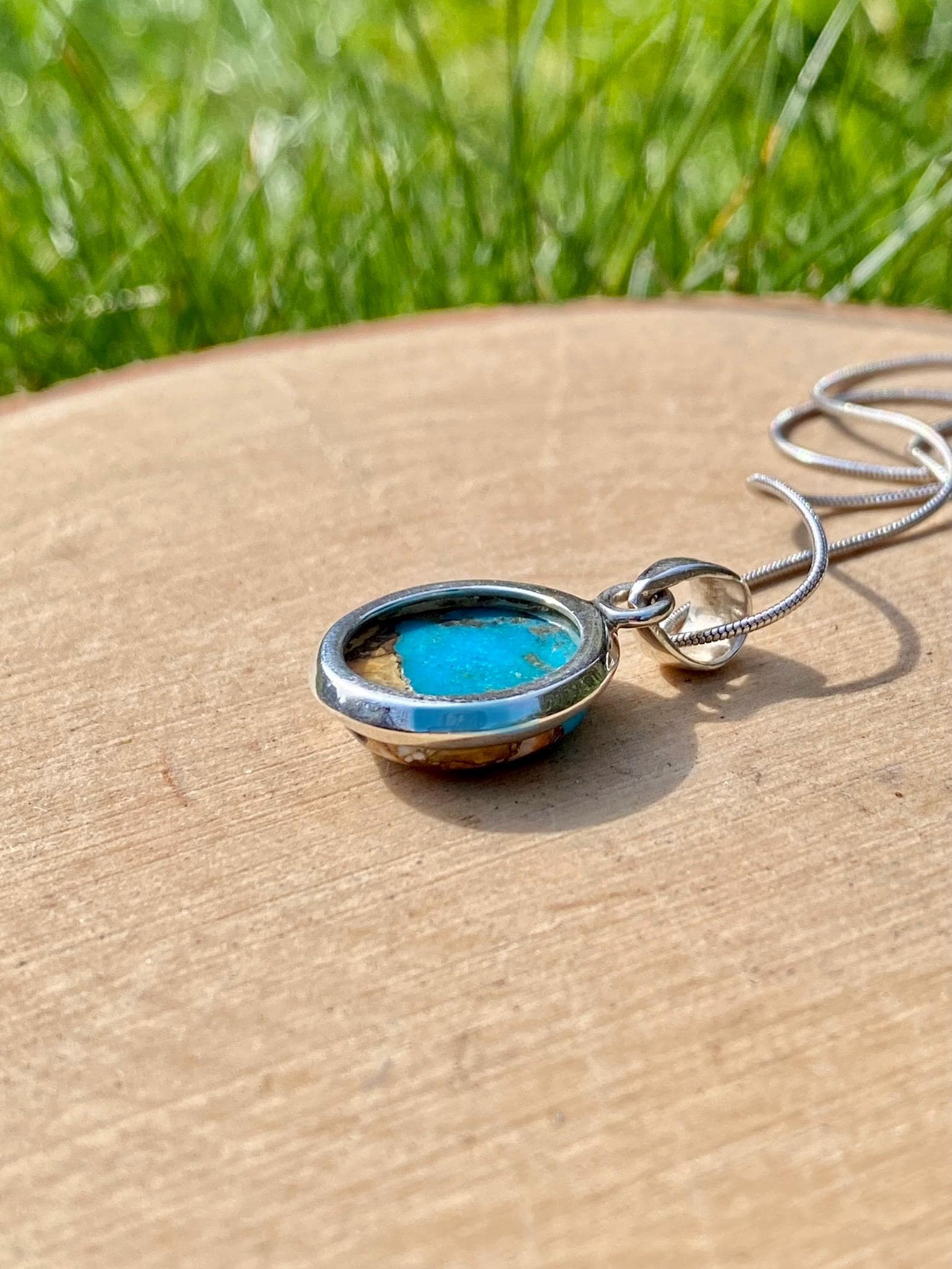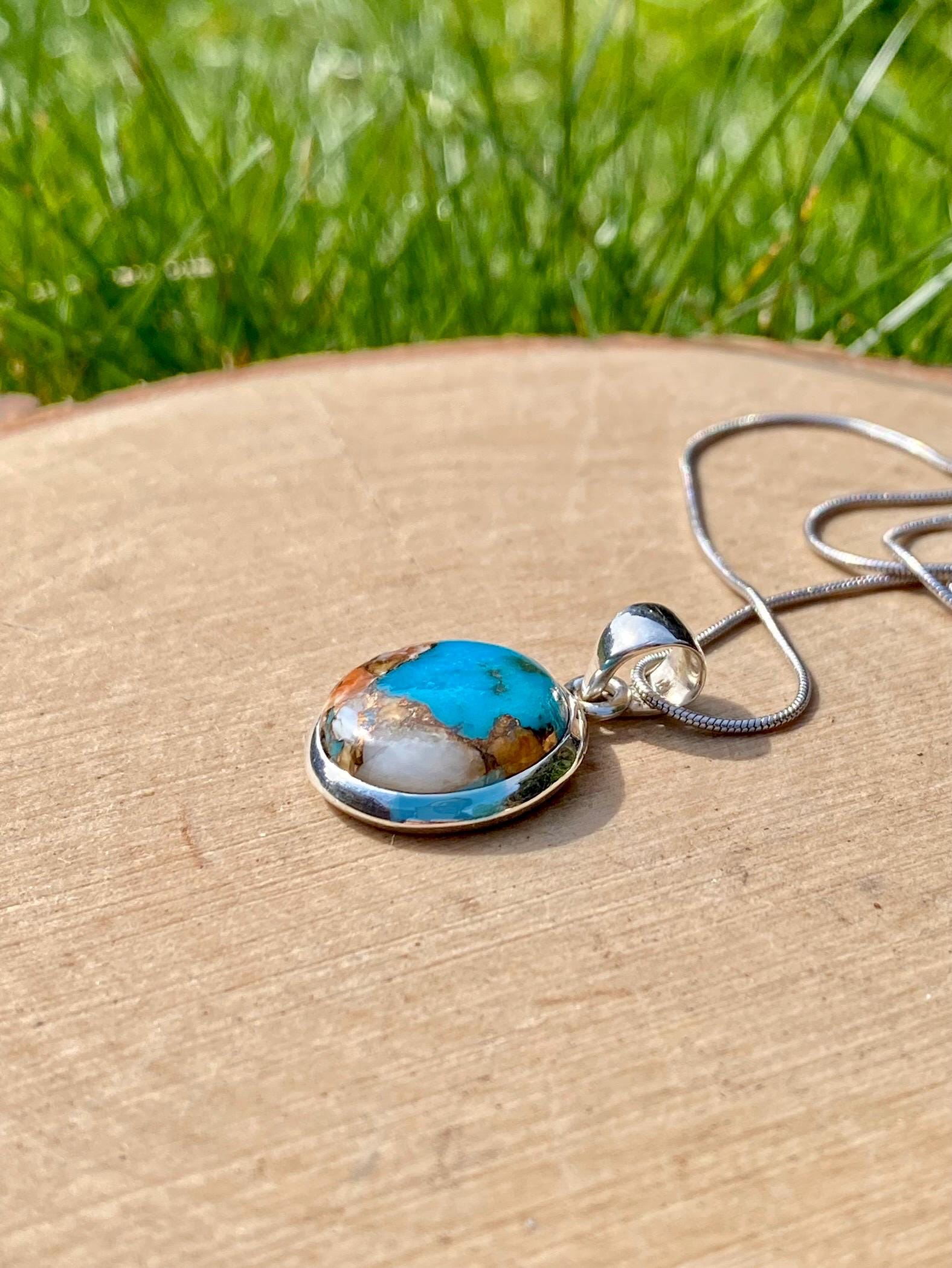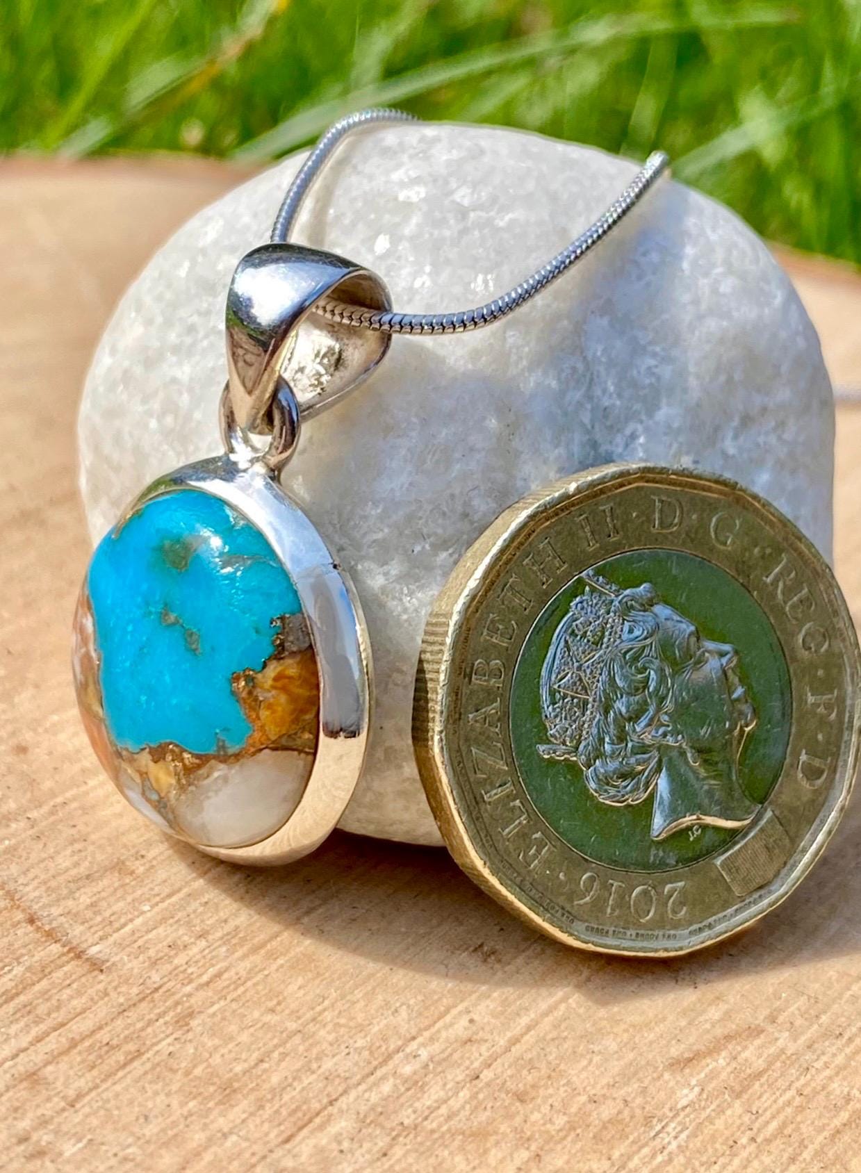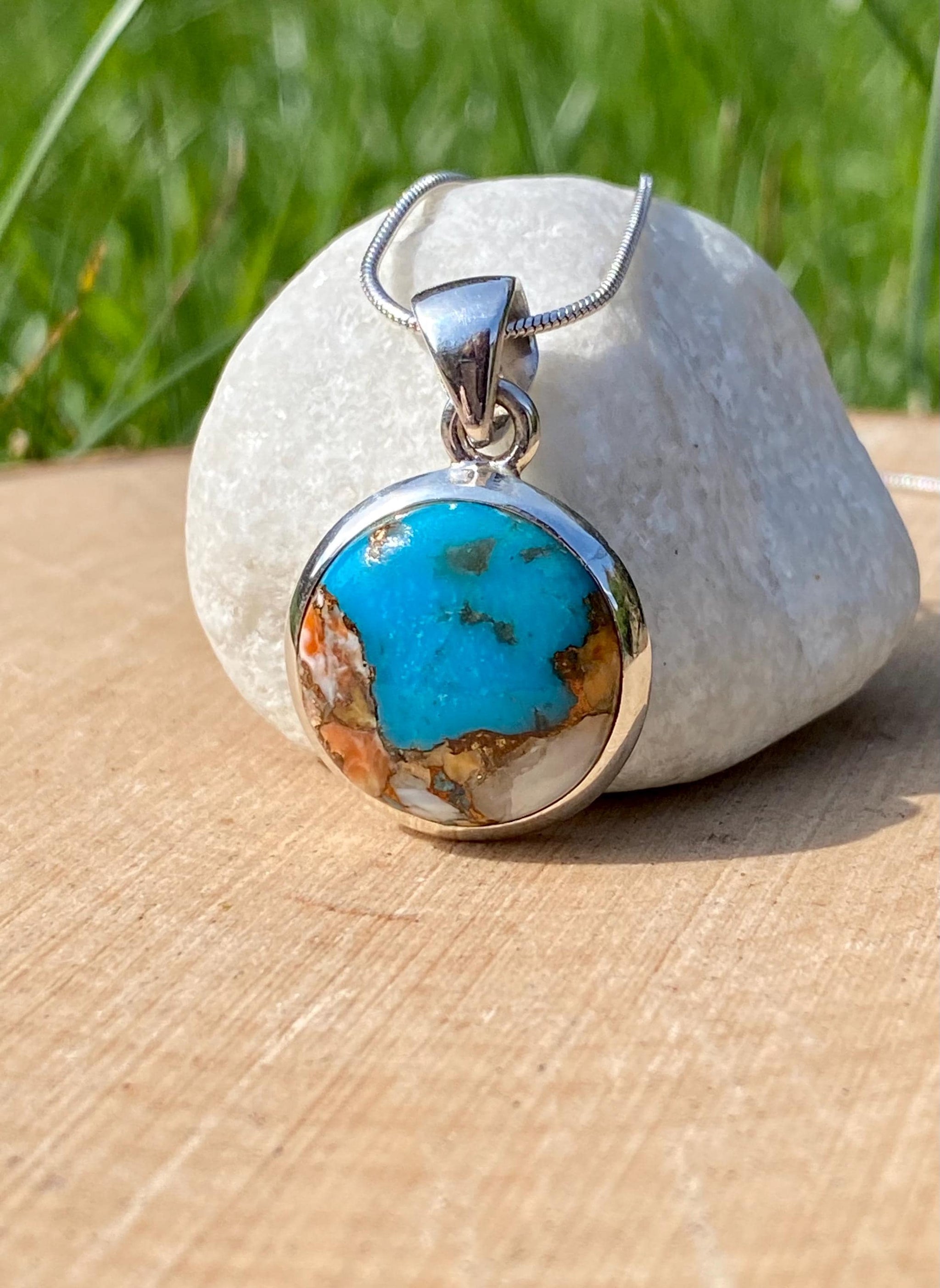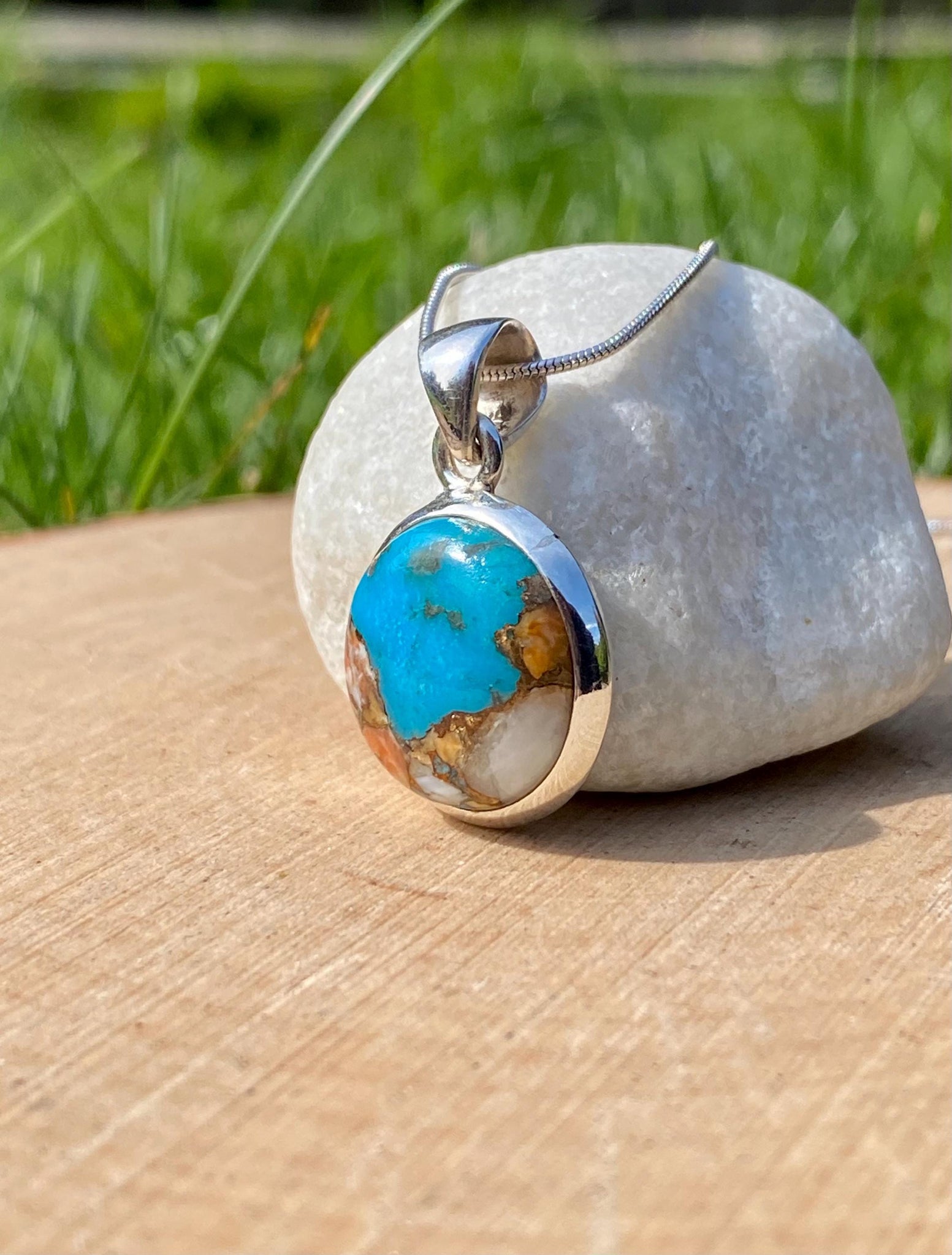 A complex yet exciting high quality Spiny Oyster and Arizonian Turquoise 925 Sterling silver pendant.