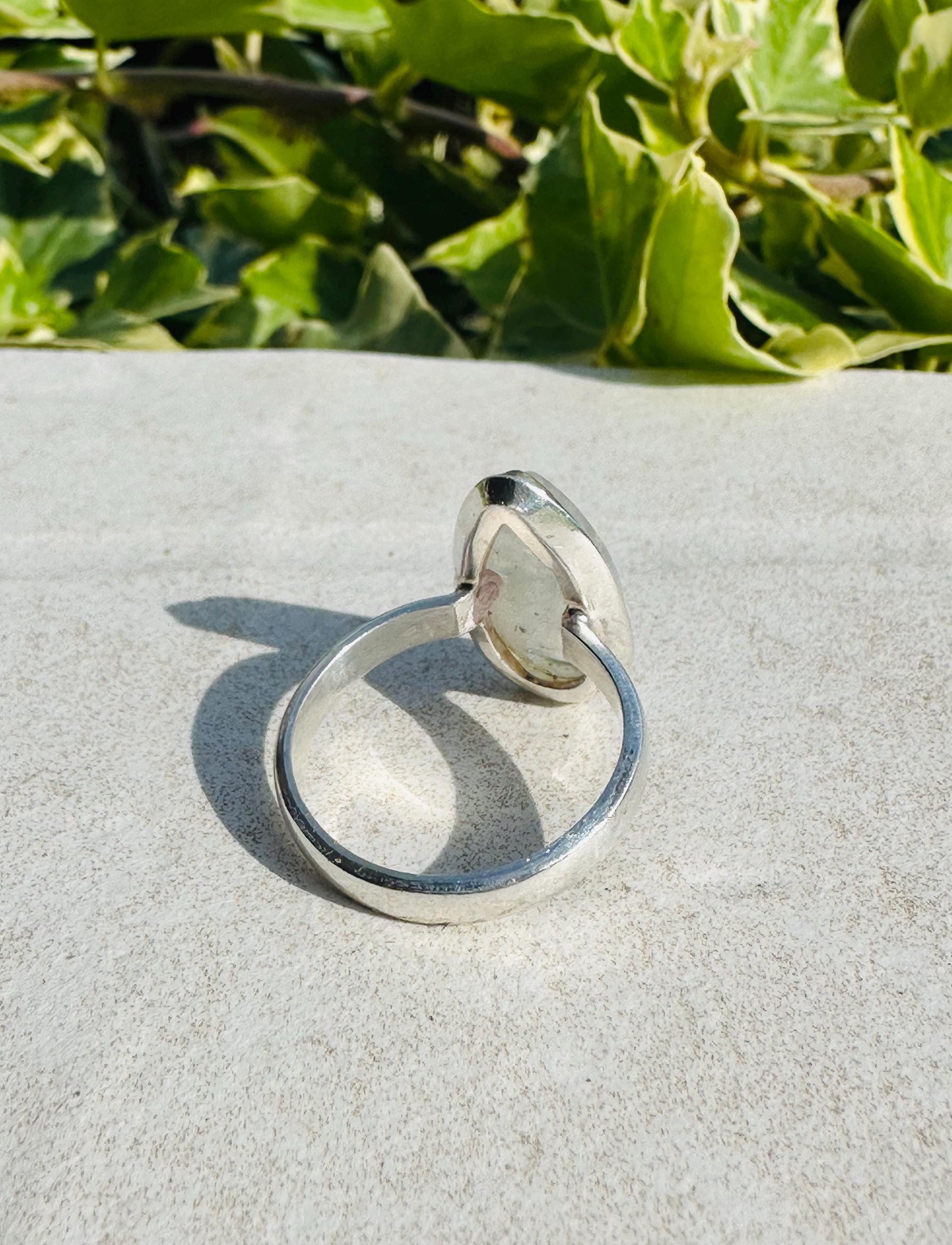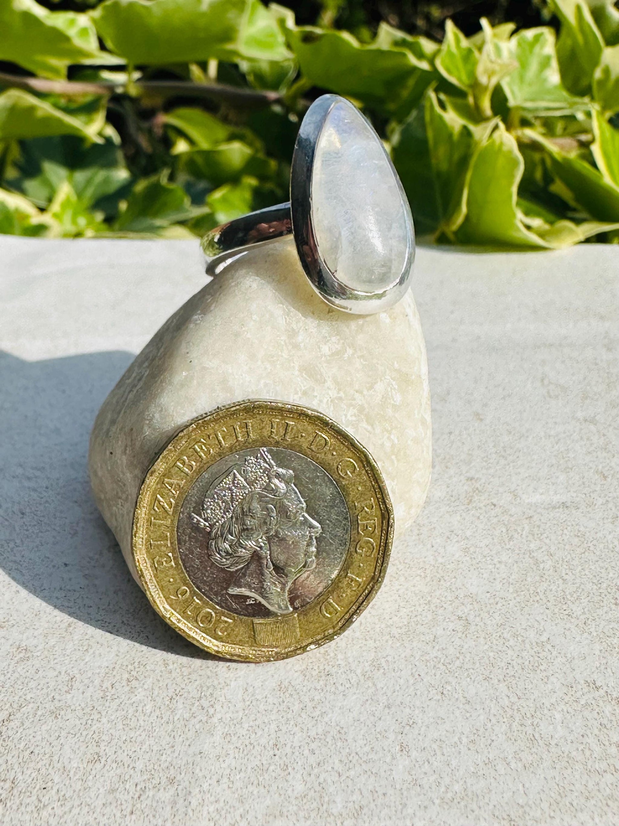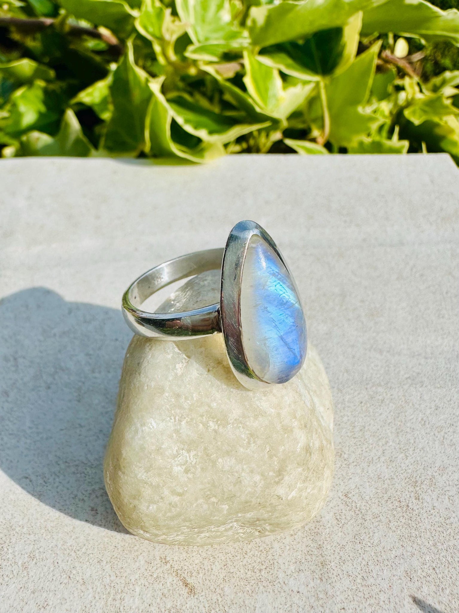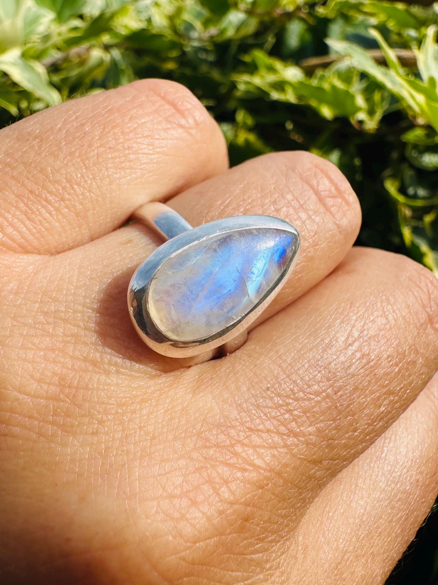 A beautifully iridescent Moonstone Blue Fire Teardrop Cabochon 925 Silver Ring