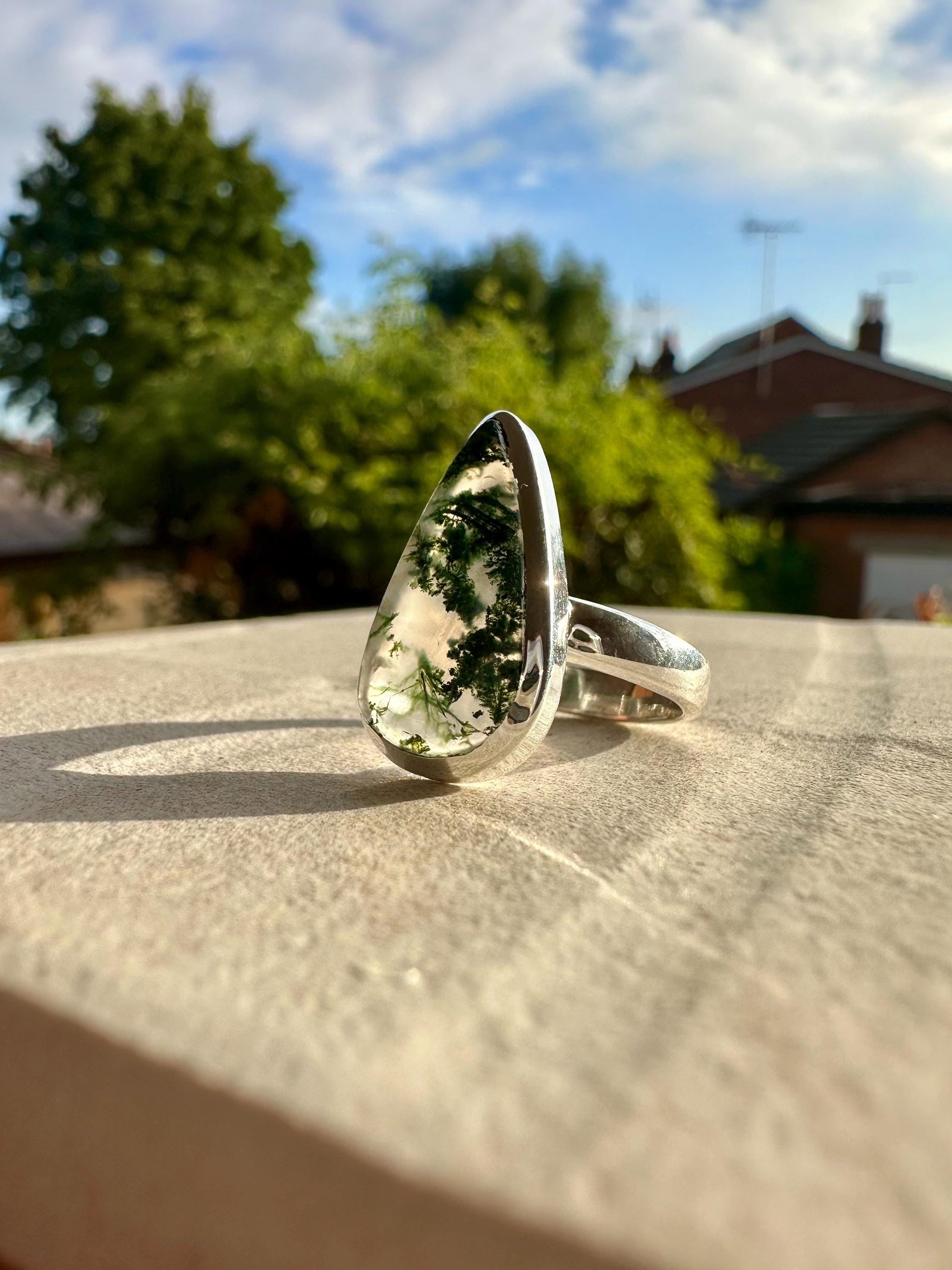 A high quality and beautifully elegant Moss Agate ring, pear-cut with a green mossy gemstone set in the classic 925 Silver bezel.