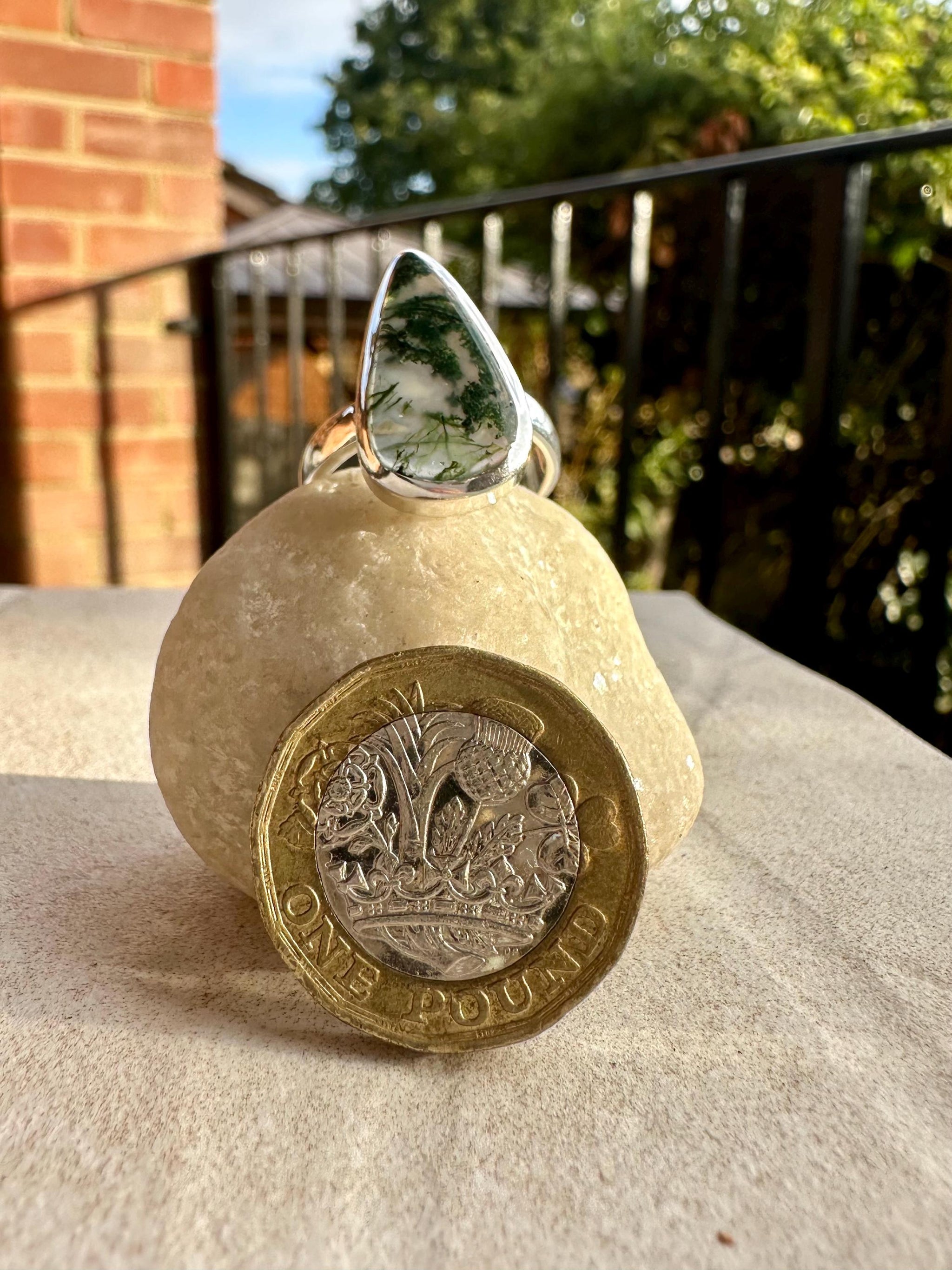 Moss Agate Sterling Silver Ring: Handmade Gemstone Jewelry, UK Size P1/2 / US 8