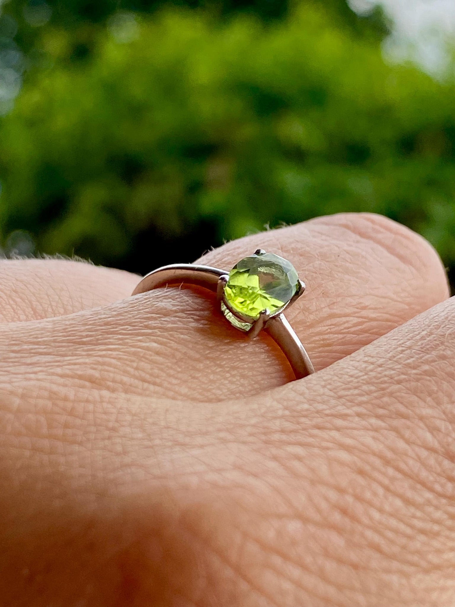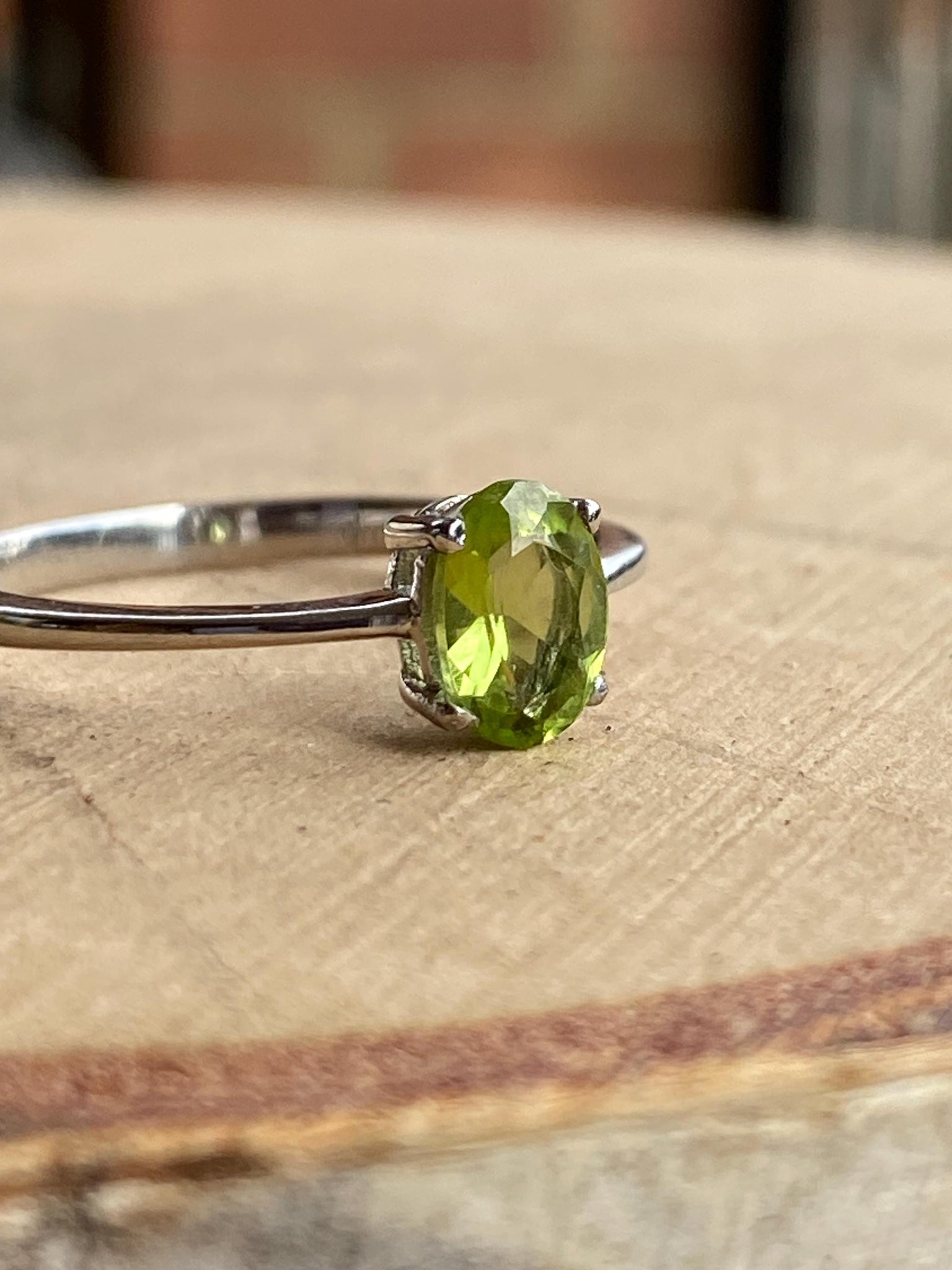 A beautiful and eye-catching Oval cut Peridot and 925 Sterling silver 4 prongs setting ring.