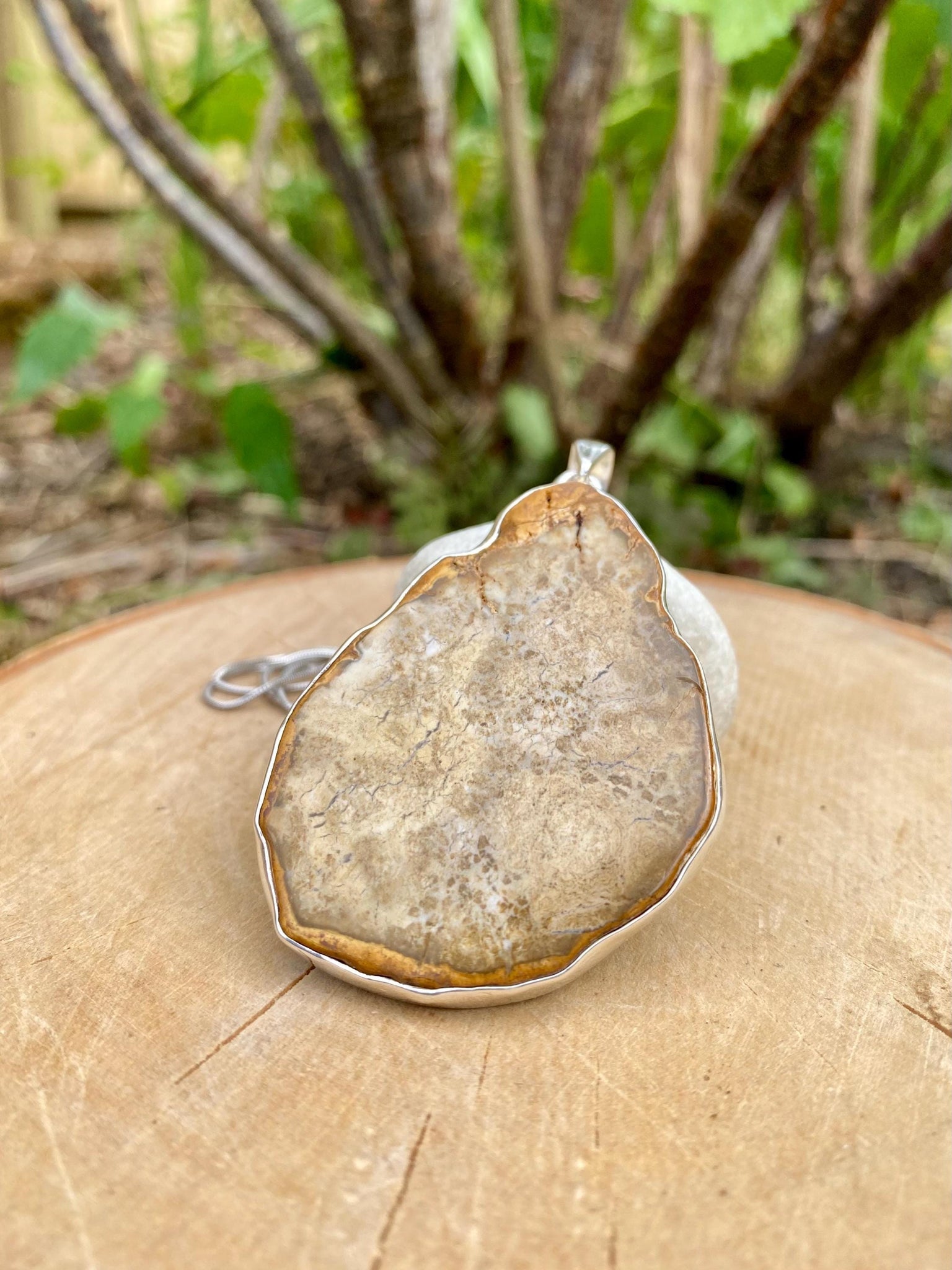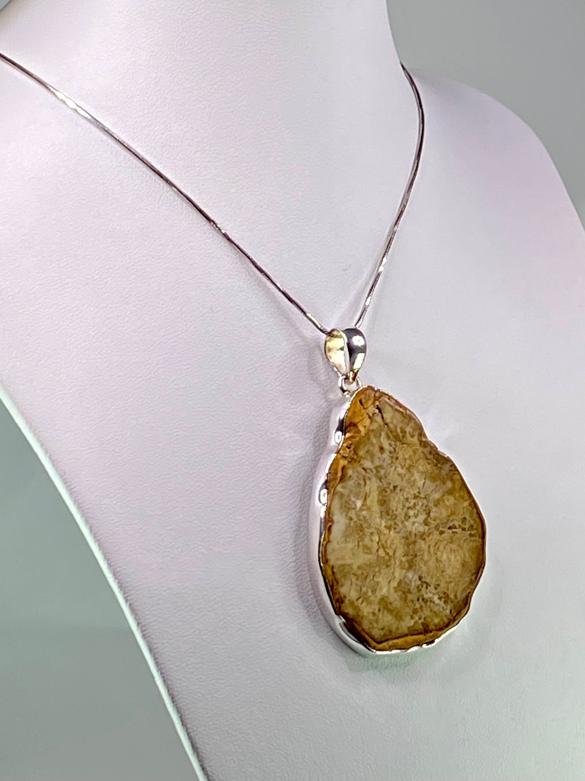Petrified Wood Slice Pendant, Pear Cut 51mm x 40mm, Sterling Silver, Handmade UK gift