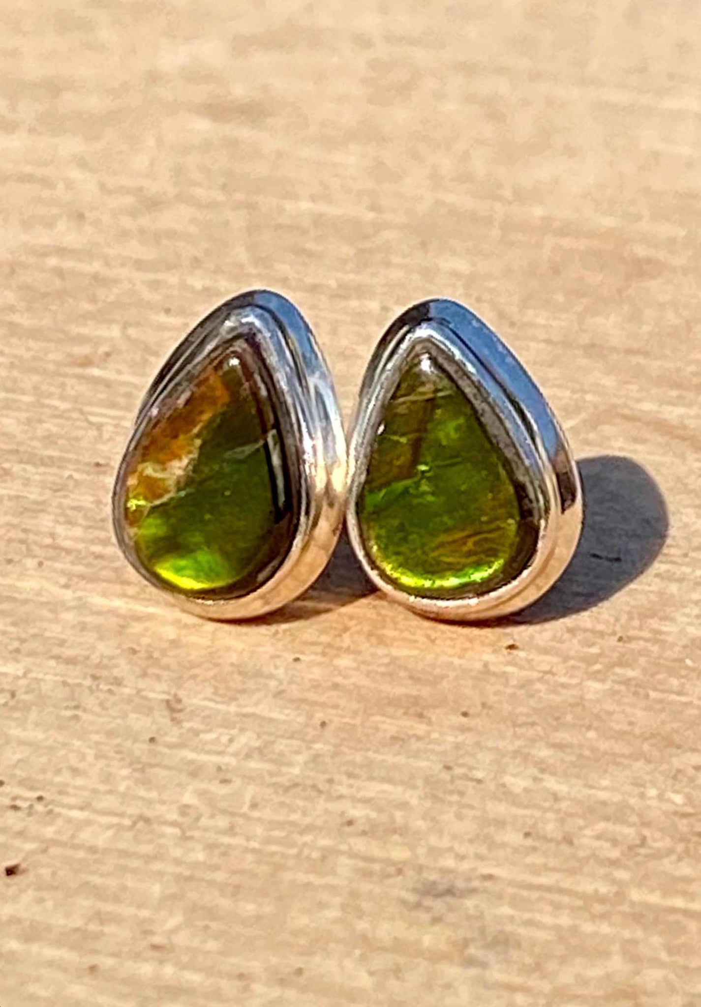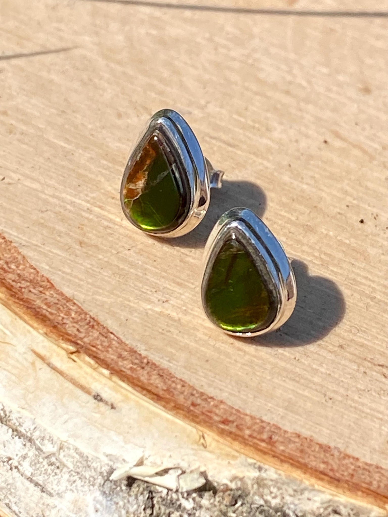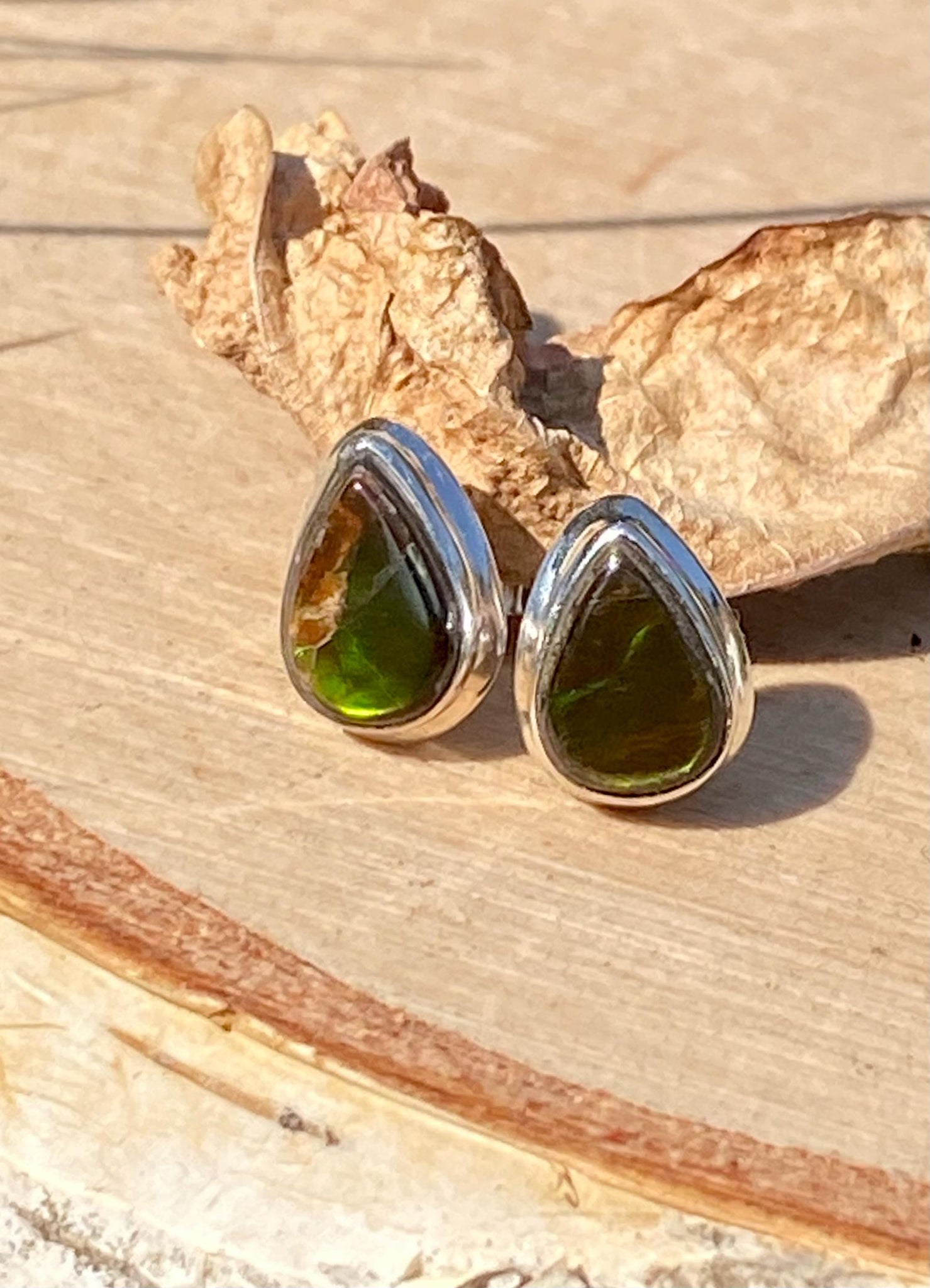 The shimmering, almost colour shifting, green, orange and blue reflection, intensely detailed Ammolite stone stud earrings are set in 925 Sterling silver.