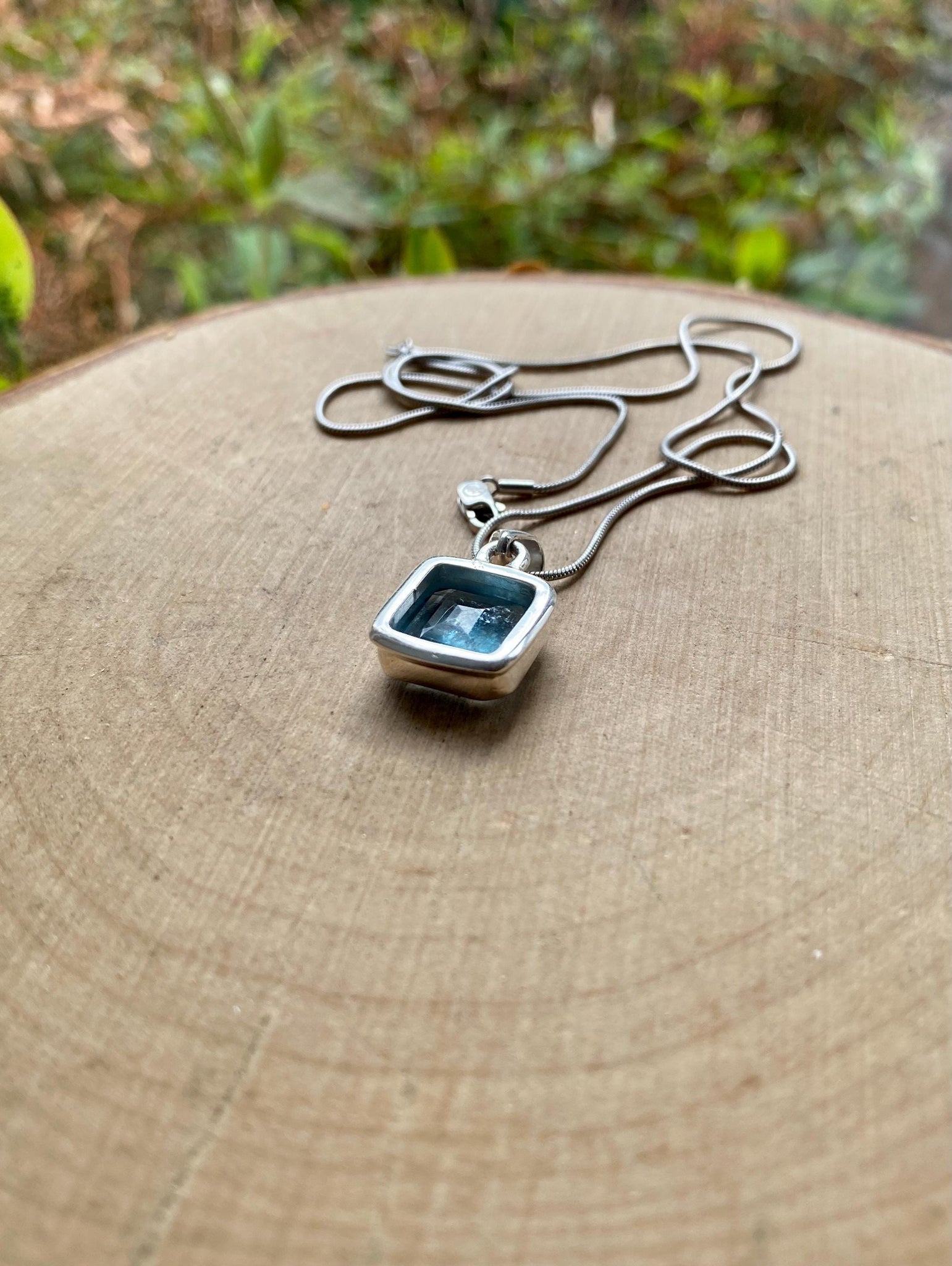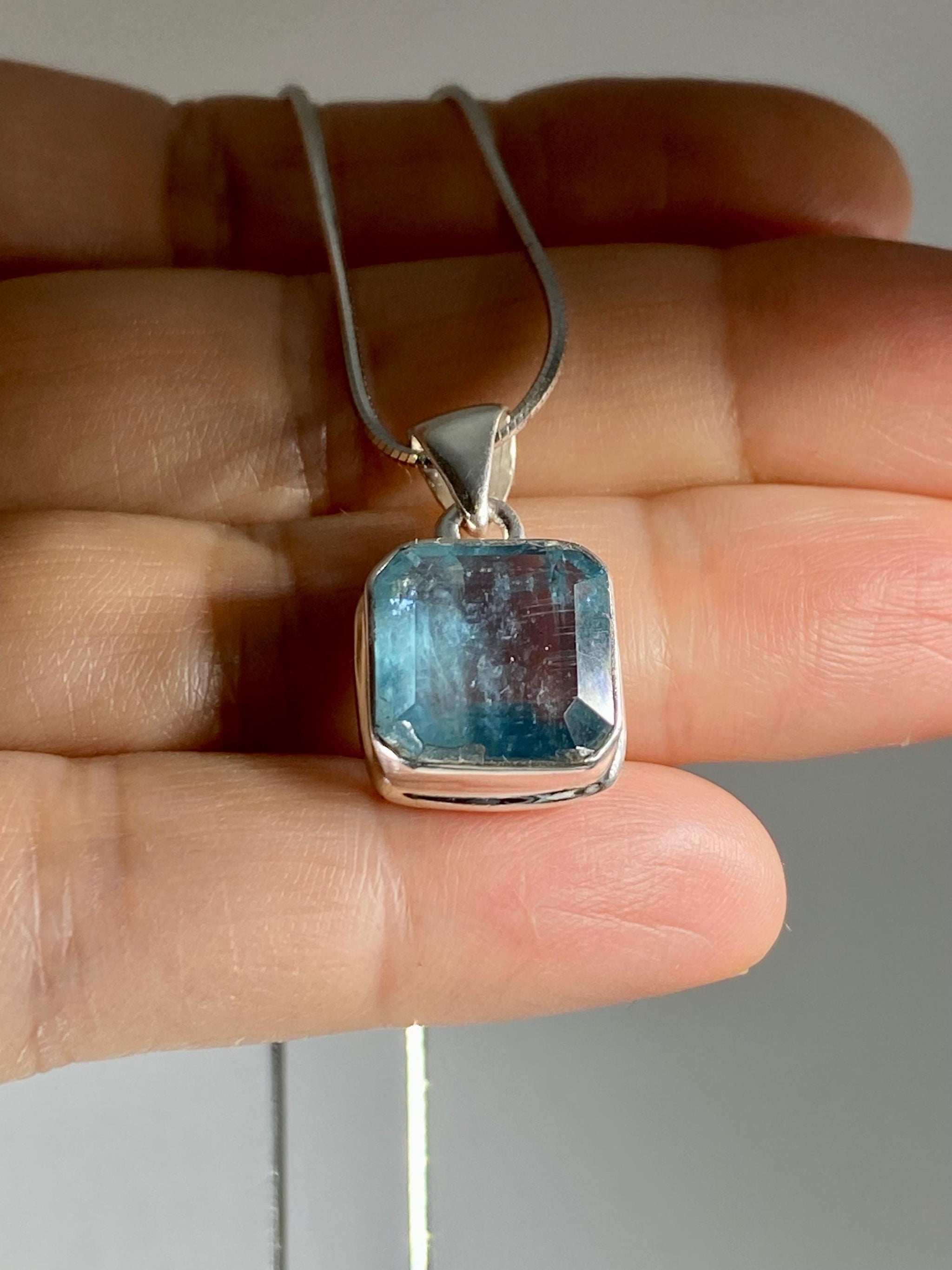 Genuine Brazilian Aqua Kyanite gemstone piece set in solid sterling silver bezel. Its appearance, reminiscent of the deepest parts of the sea, captivates with shades ranging from the palest aqua to rich, deep blues.