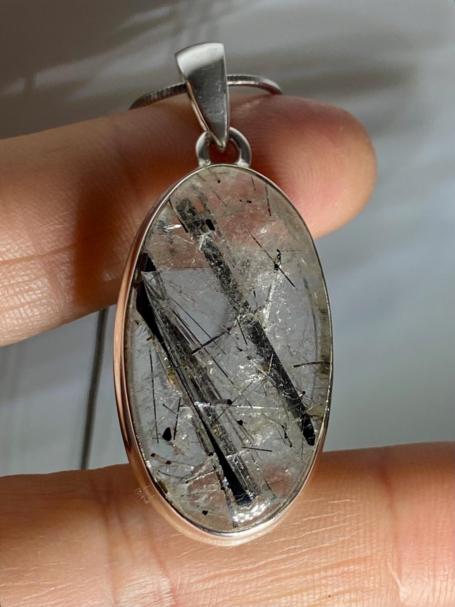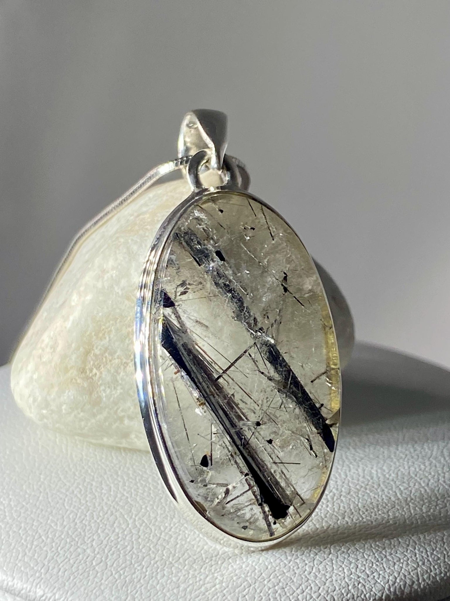An eye-catching Black Rutile Tourmaline in Quartz and solid silver pendant.