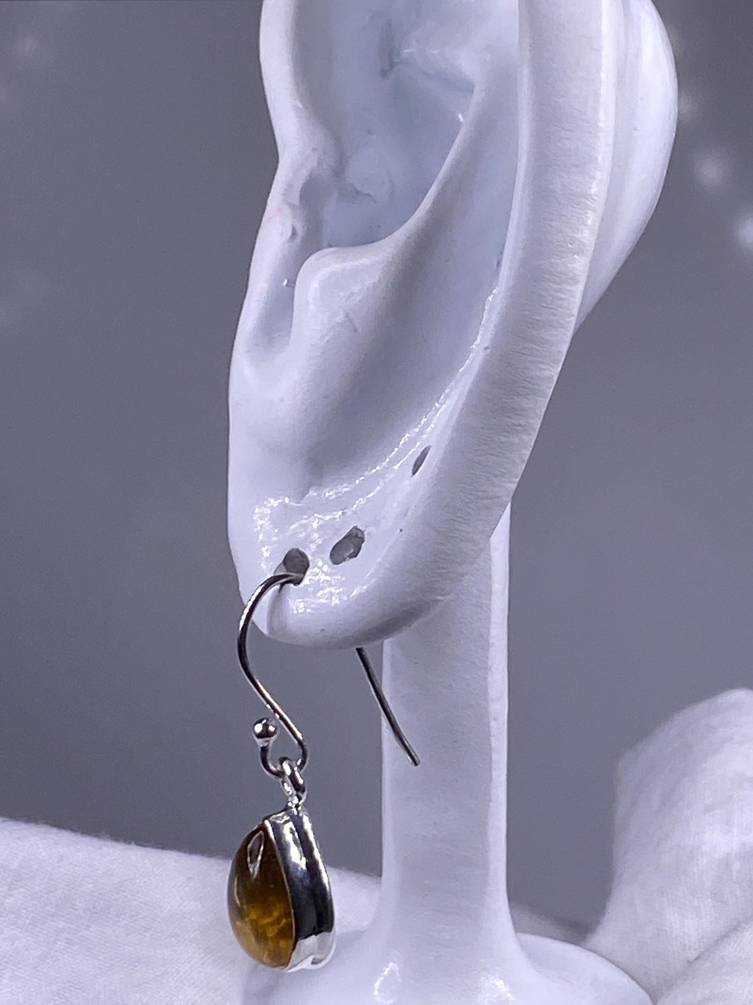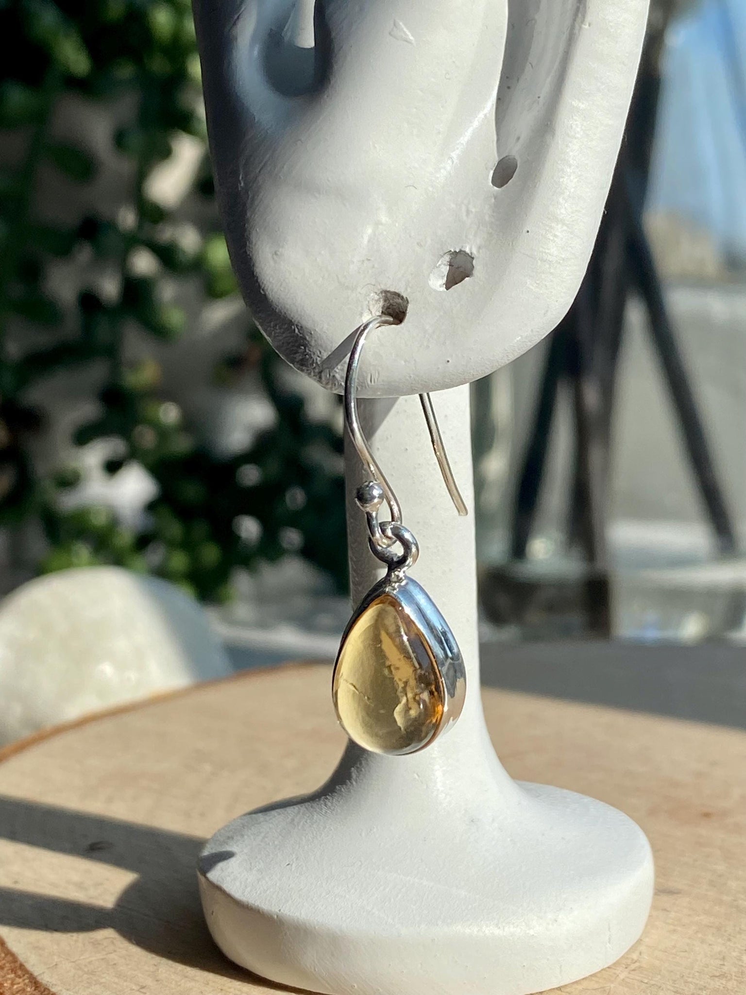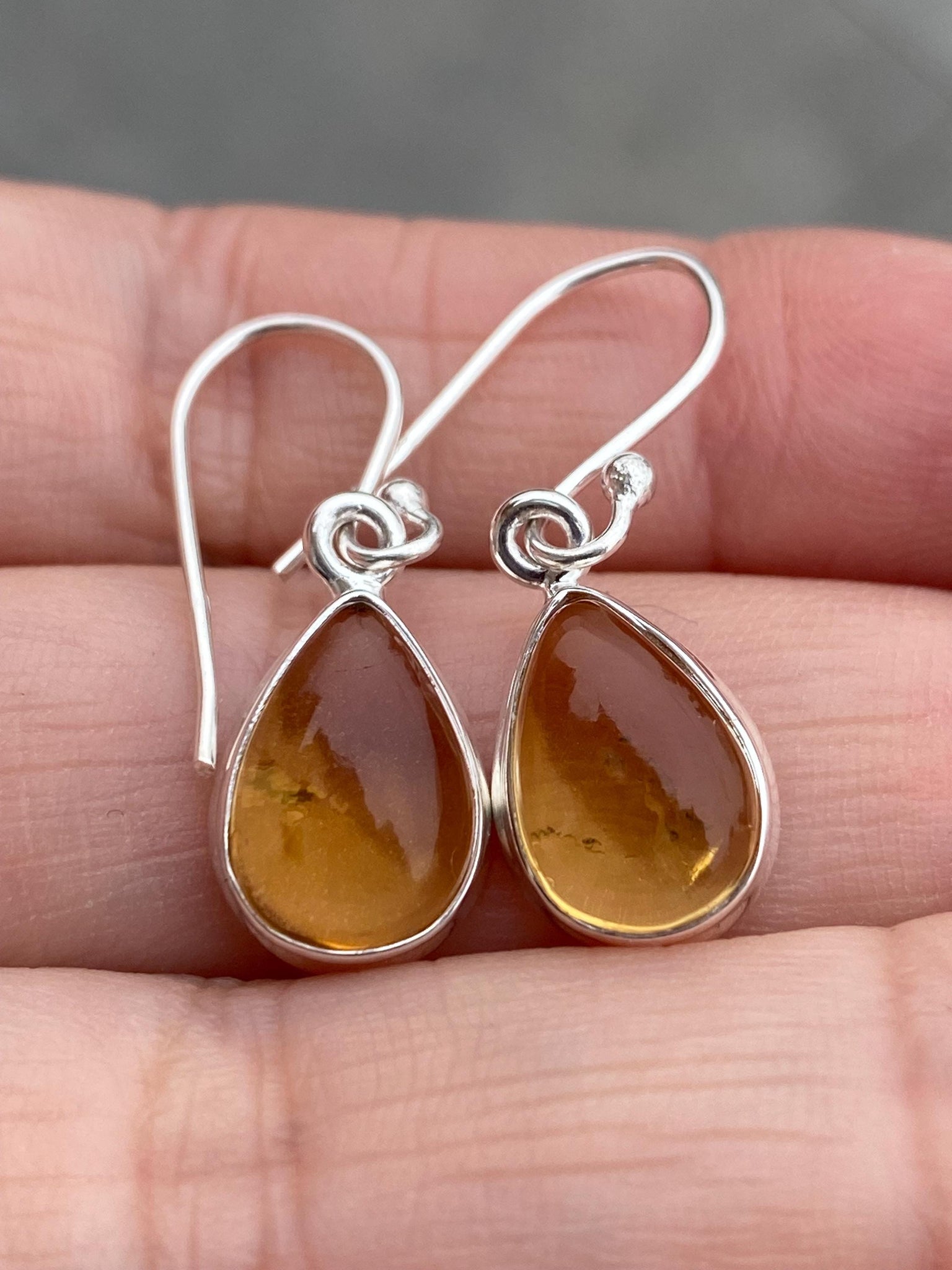 A pair of handmade Genuine Citrine cabochon dangle earrings, pear-cut and set in 925 Silver bezel.