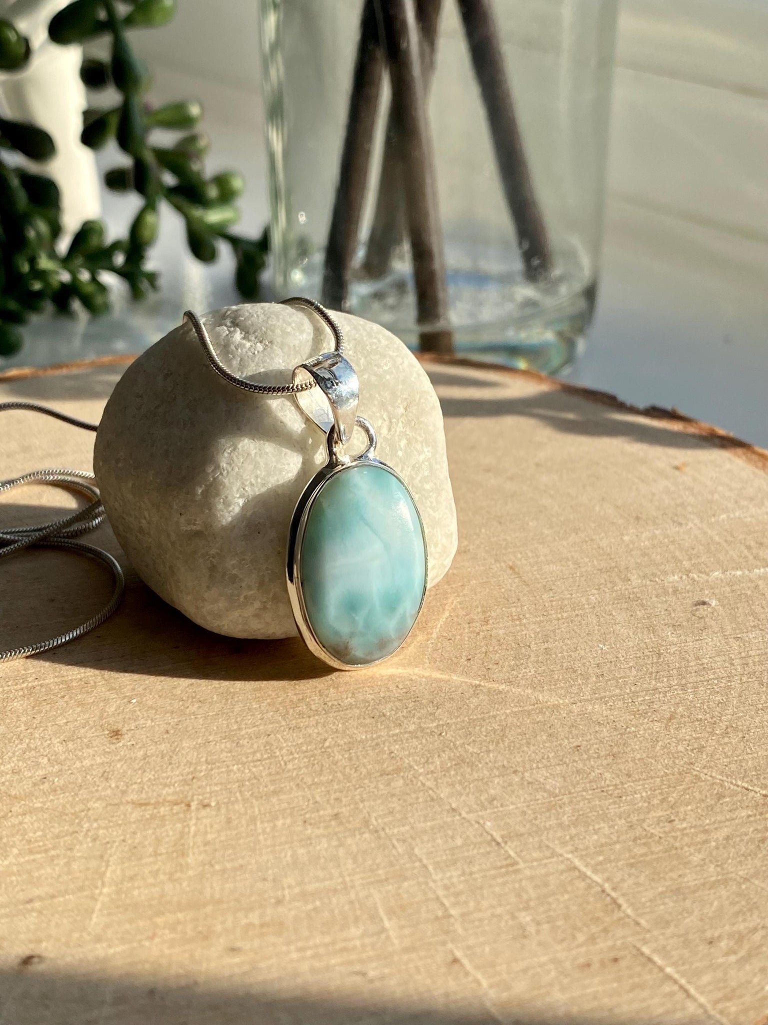 Larimar is said to enlighten and heal in a physical, emotional, mental and spiritual way. It represents peace and clarity, radiating healing and love energy.