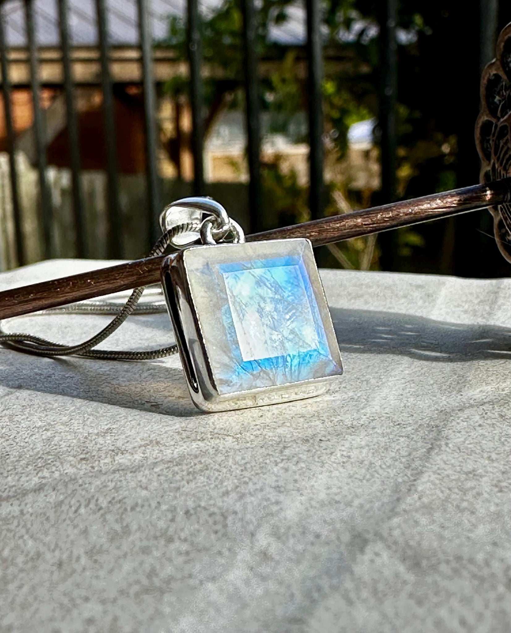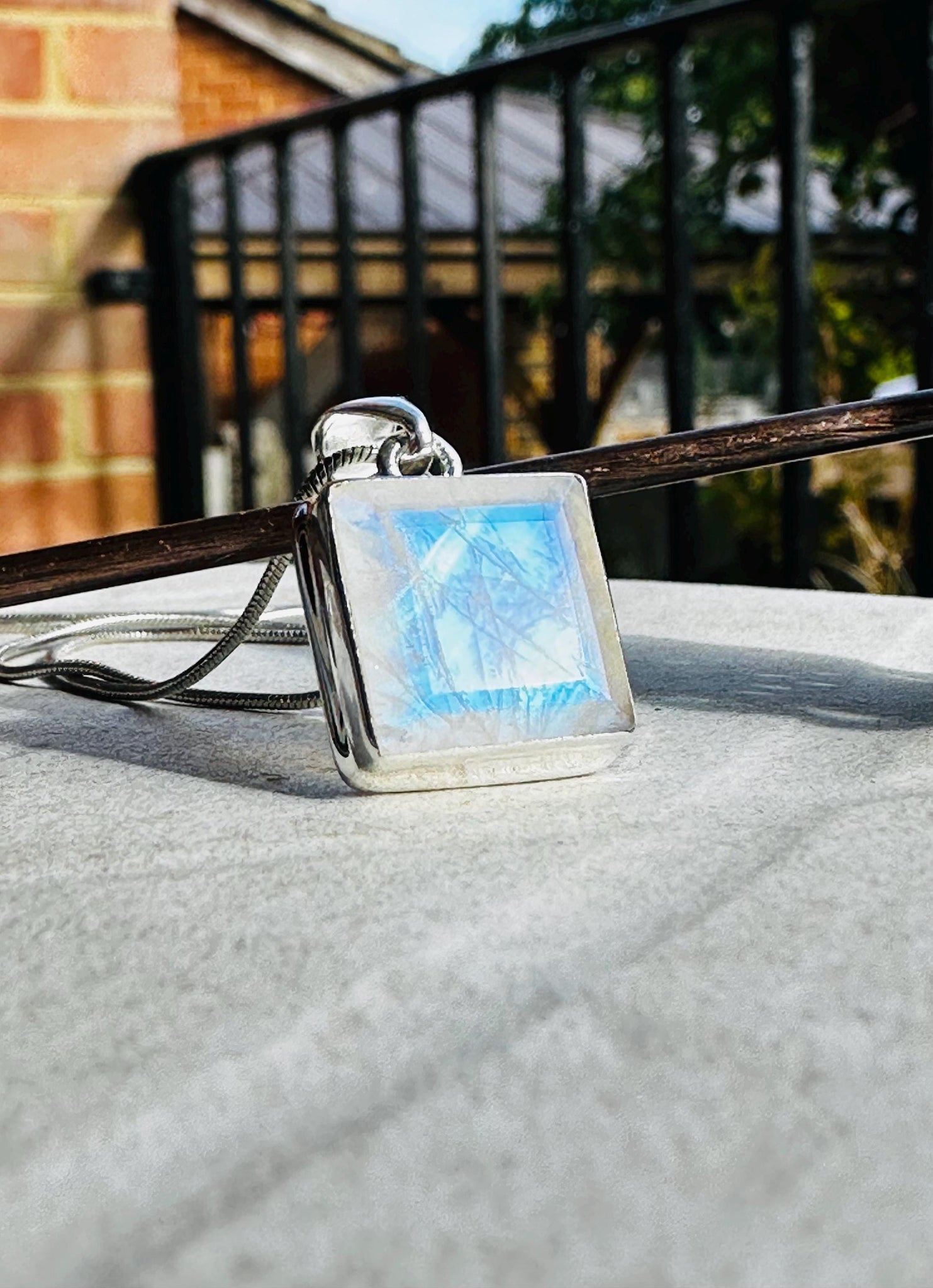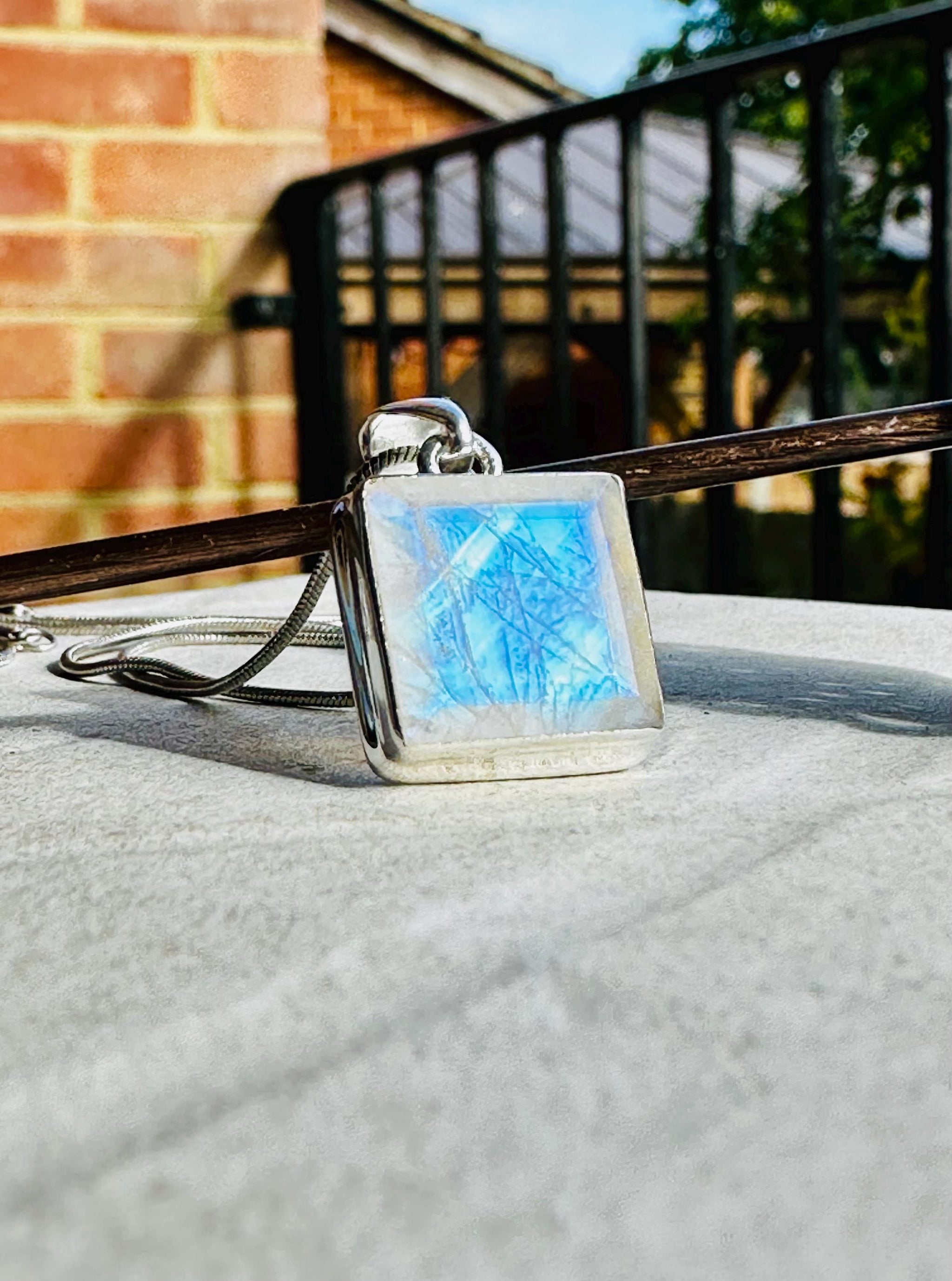 Faceted Blue Fire Moonstone Pendant: Sterling Silver, Handmade UK