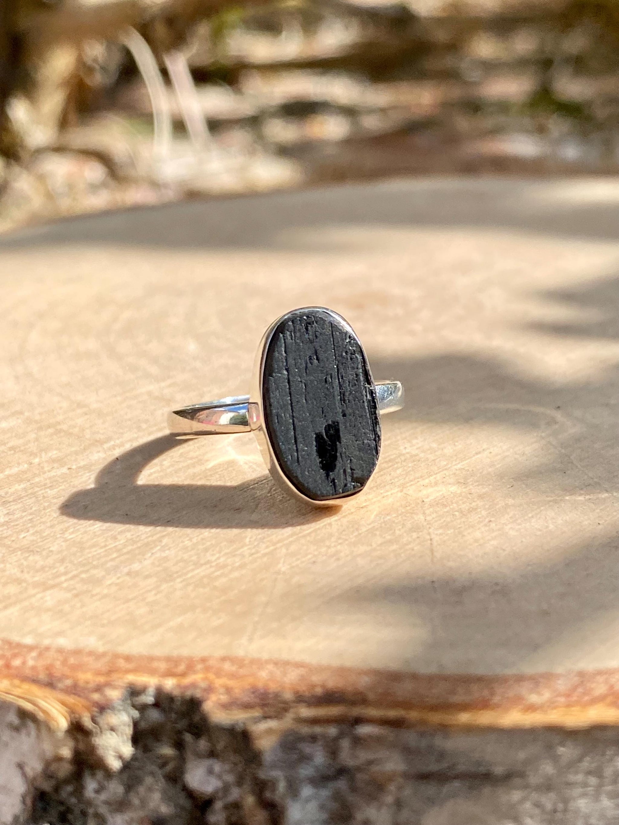 An elegant, natural Raw Black Tourmaline 925 Sterling silver ring.