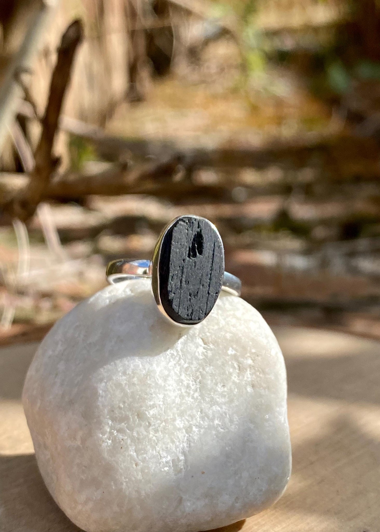 Raw Black Tourmaline Ring: Oval Sterling Silver, Handmade UK