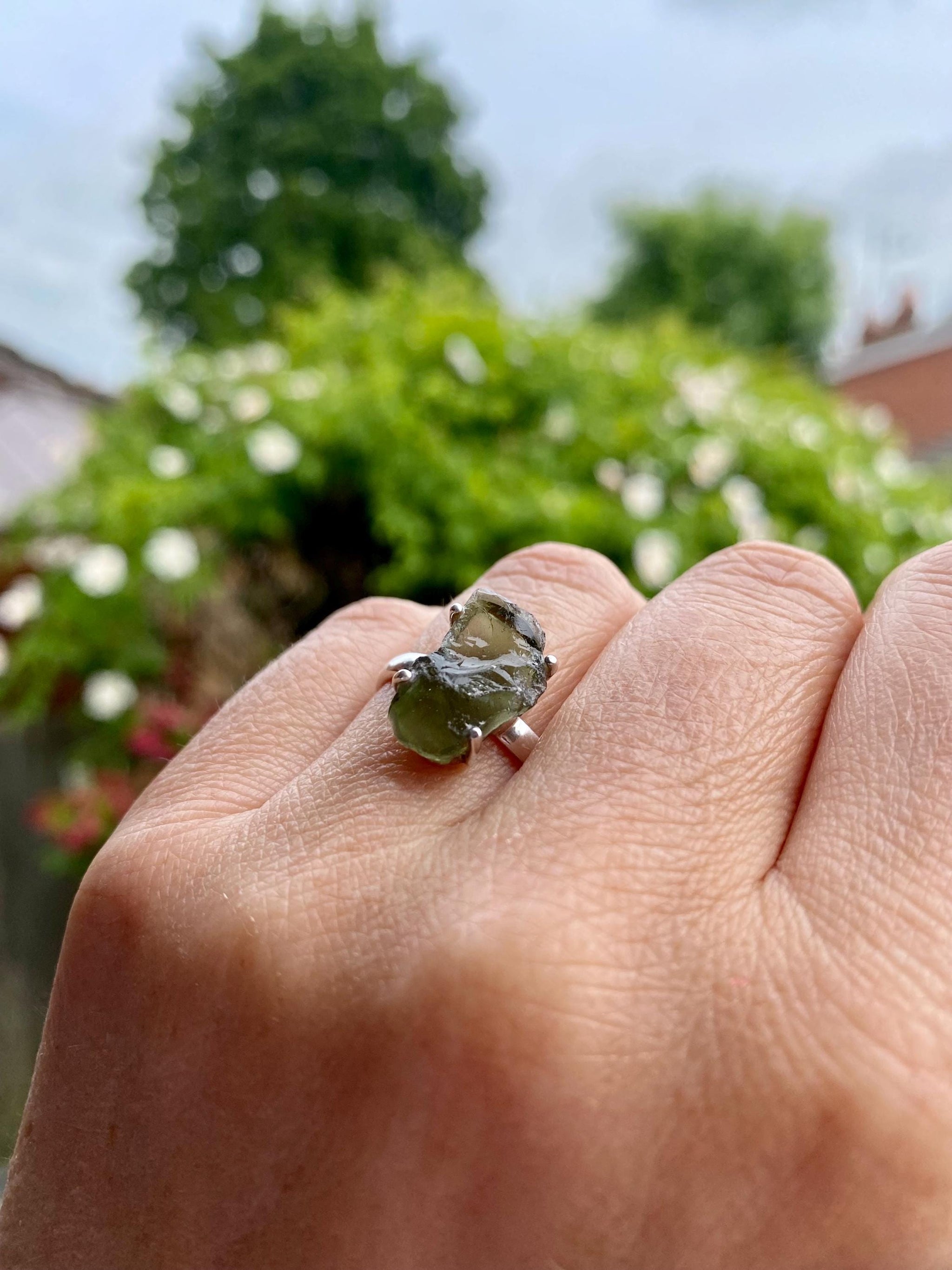 A beautifully eye-catching grade AAA certified Raw MOLDAVITE and sterling silver ring.