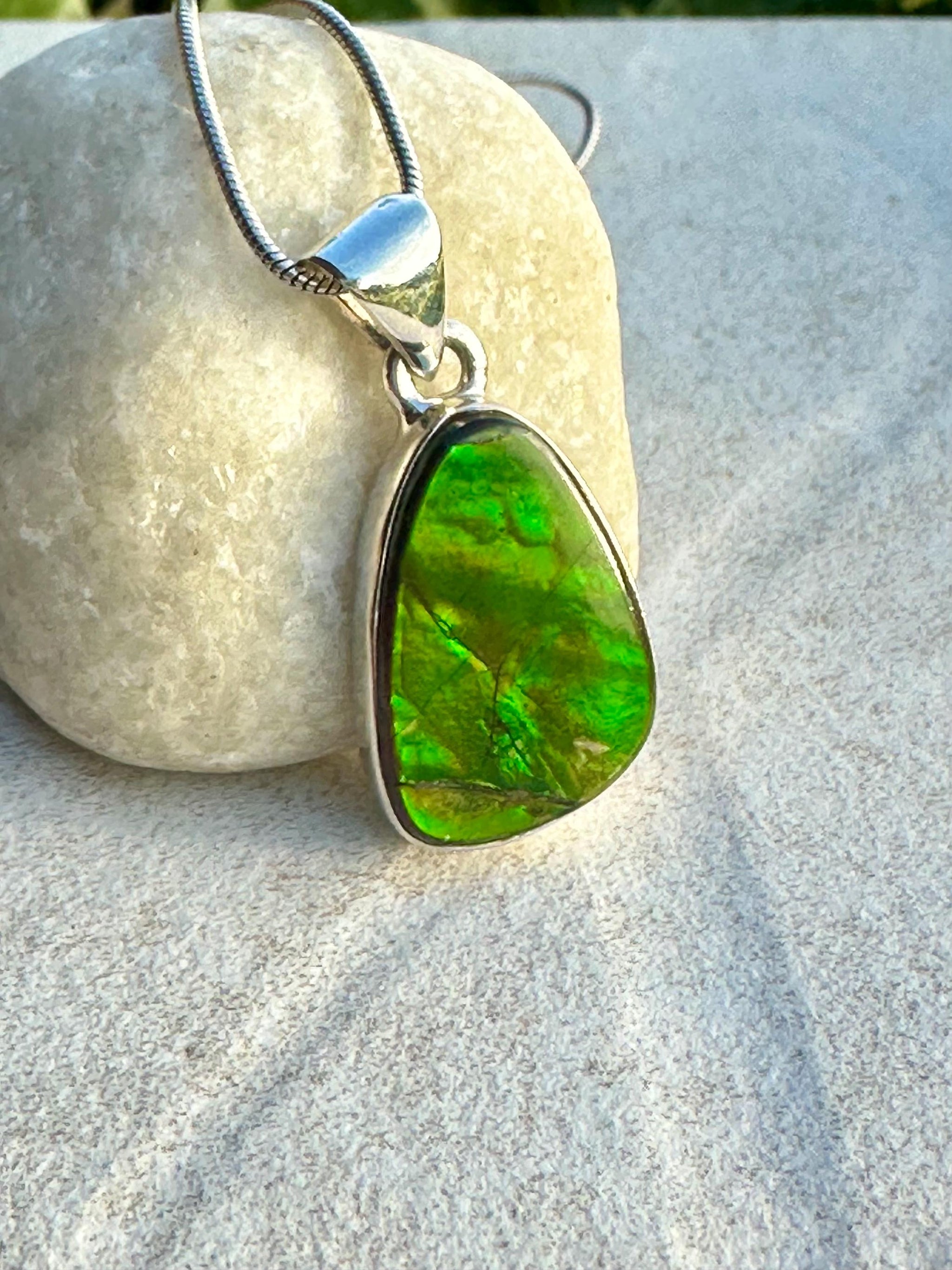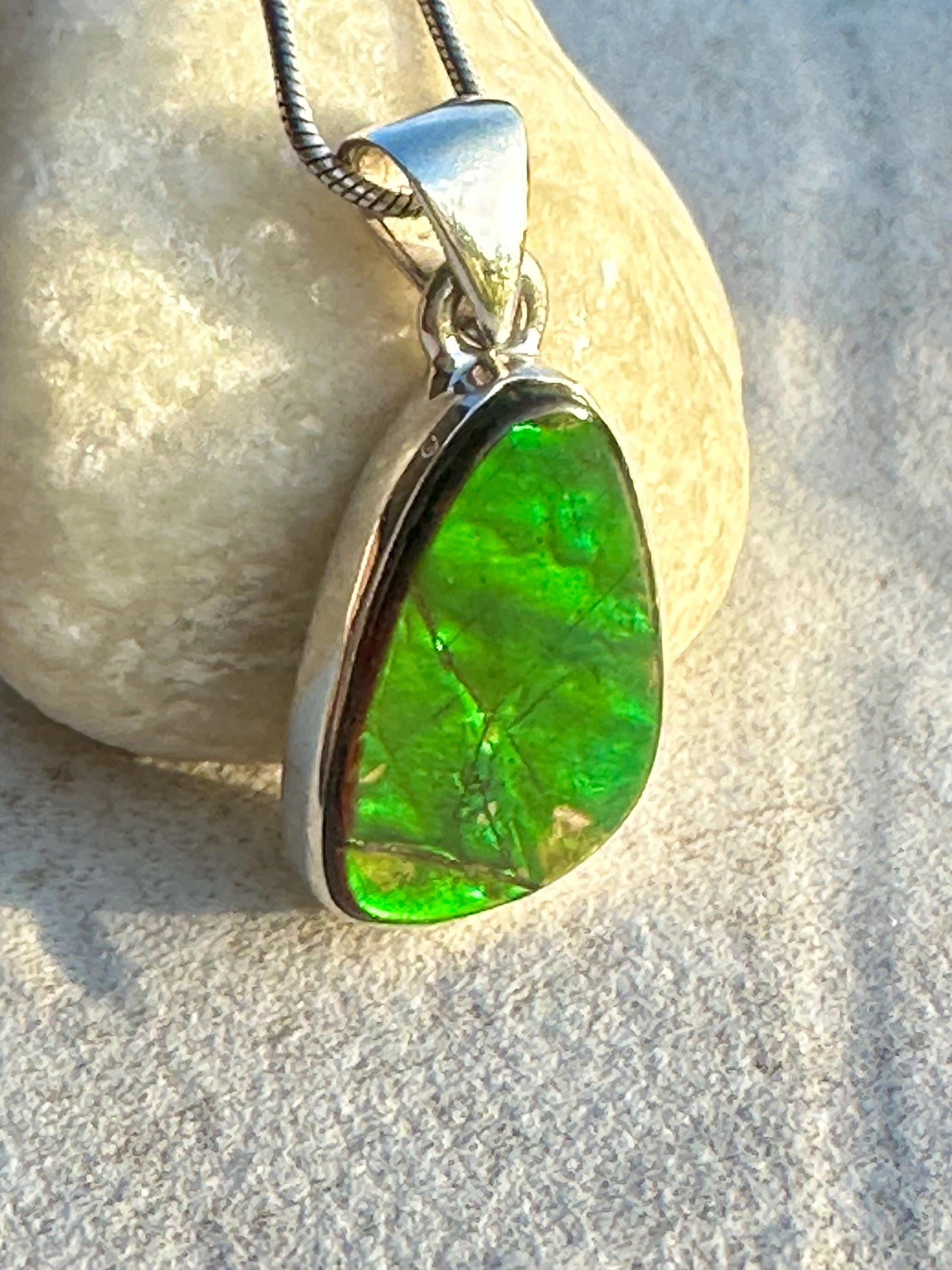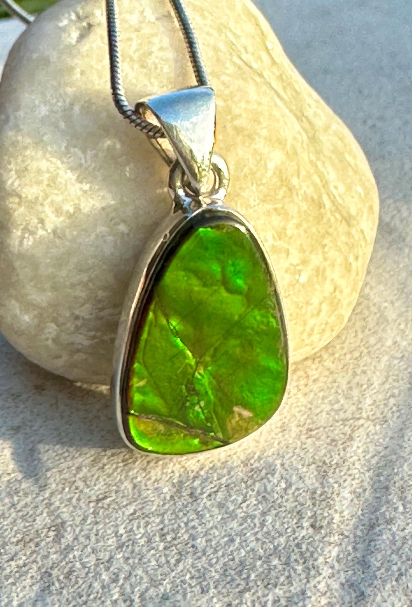 Iridescent Ammolite Pendant: Sterling Silver Pear-Cut Gemstone