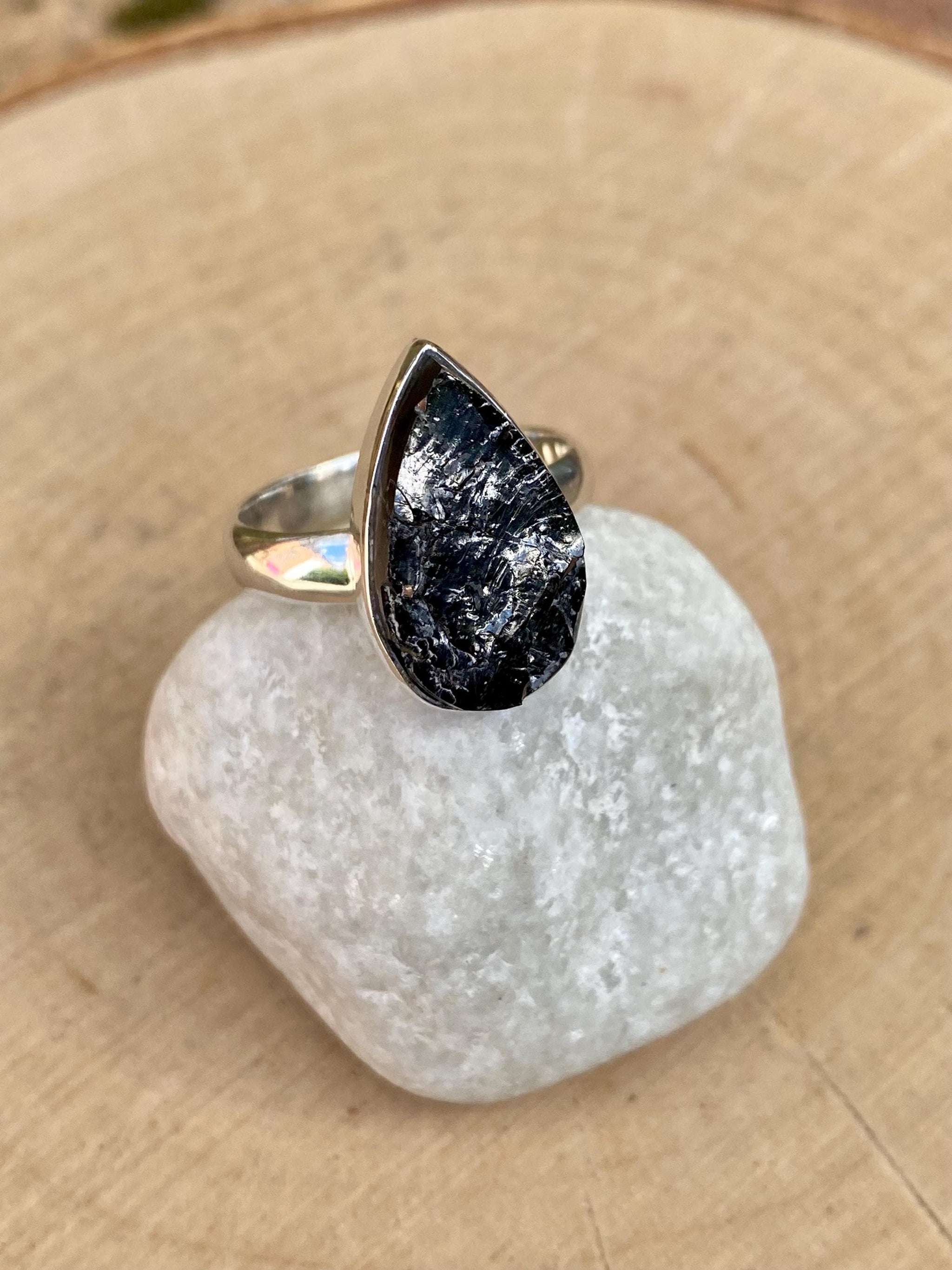 Raw Shungite Teardrop Ring: 925 Sterling Silver, Handmade UK