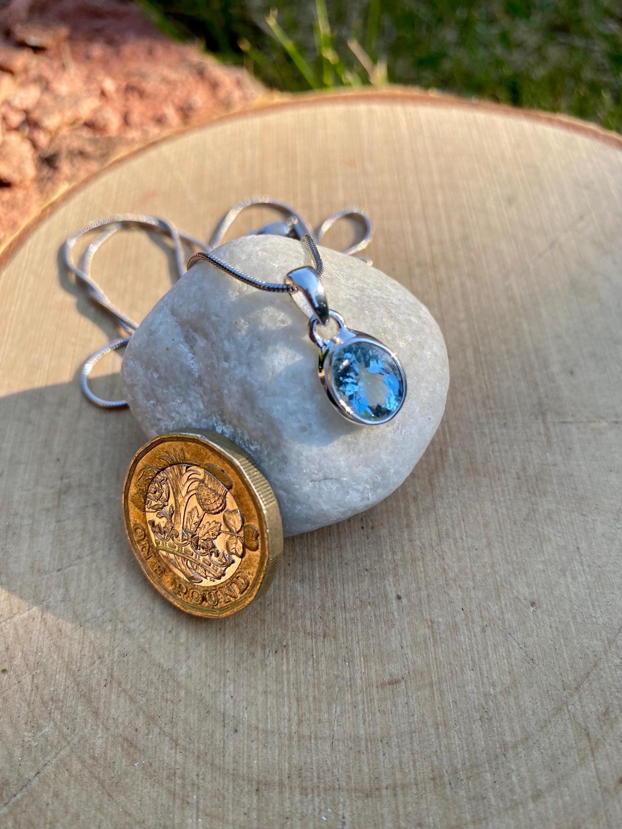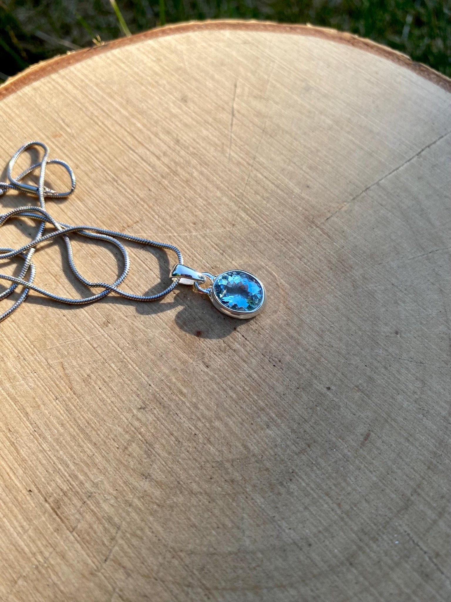 This dainty pendant features an oval-cut Aquamarine gemstone set in 925 Sterling Silver bezel.
