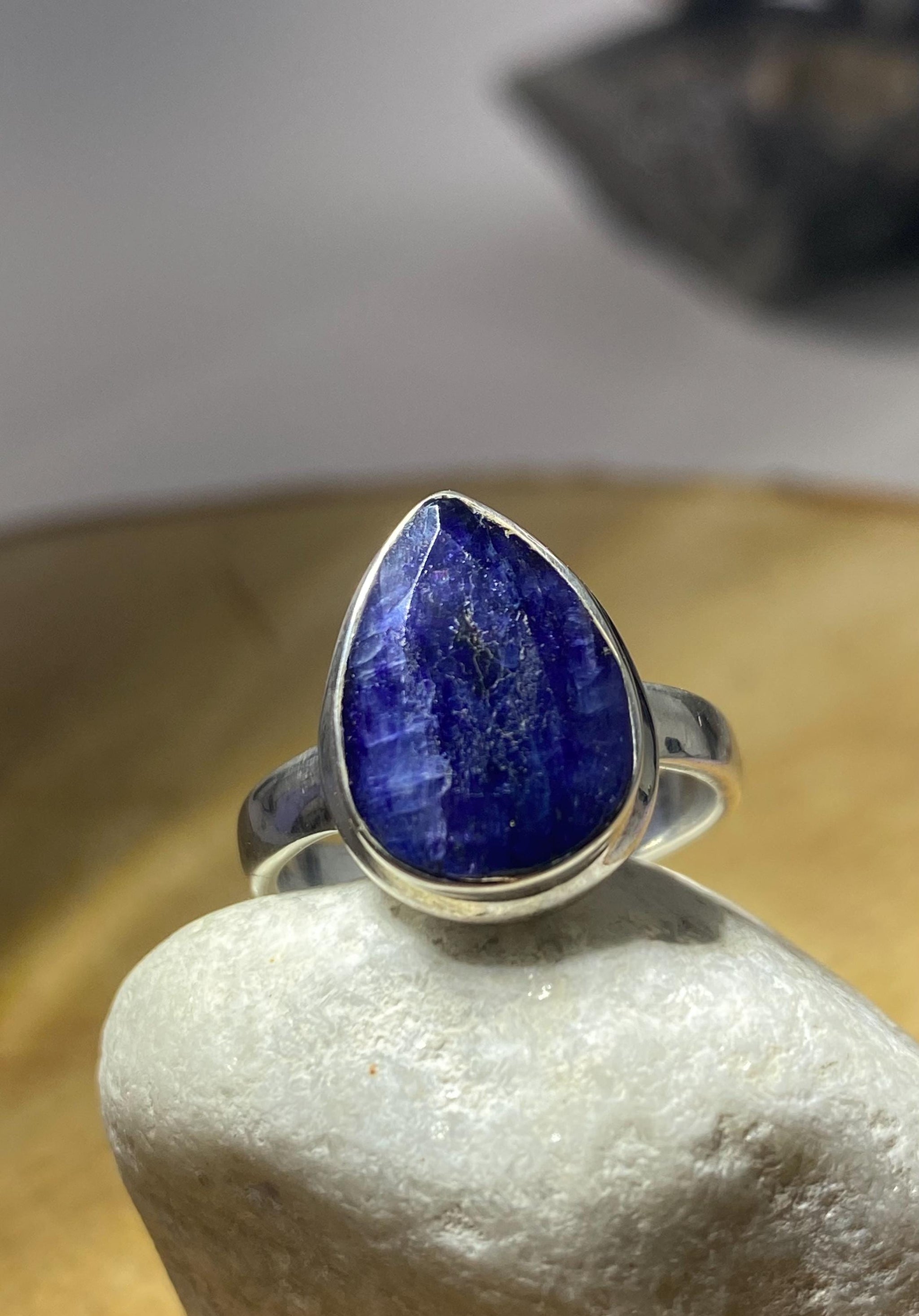 A beautiful tear drop, raw Sapphire and solid Sterling Silver ring.