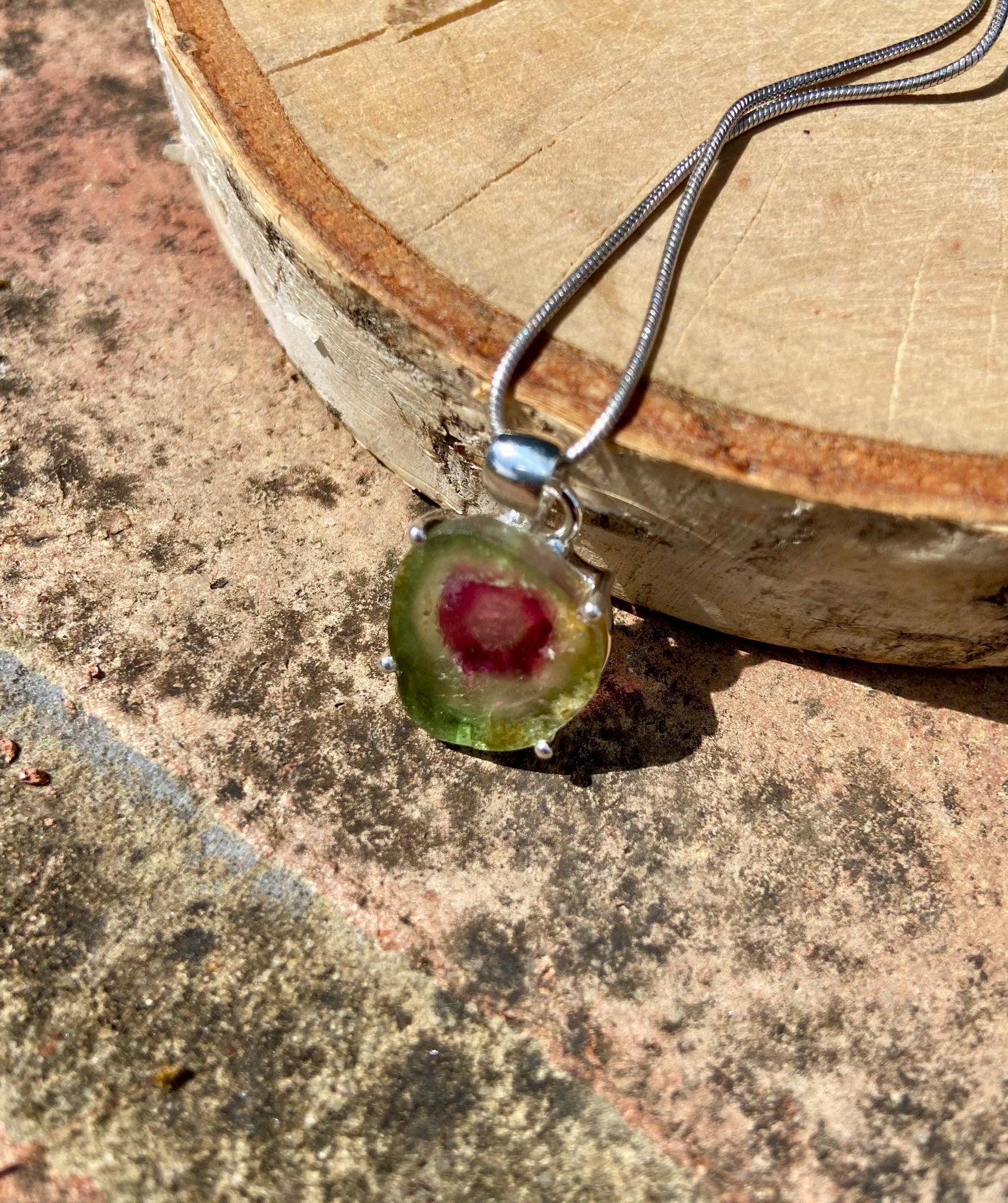 A perfect natural watermelon tourmaline and 925 sterling silver pendant, hexagon-cut and set in the classic 4 prongs.