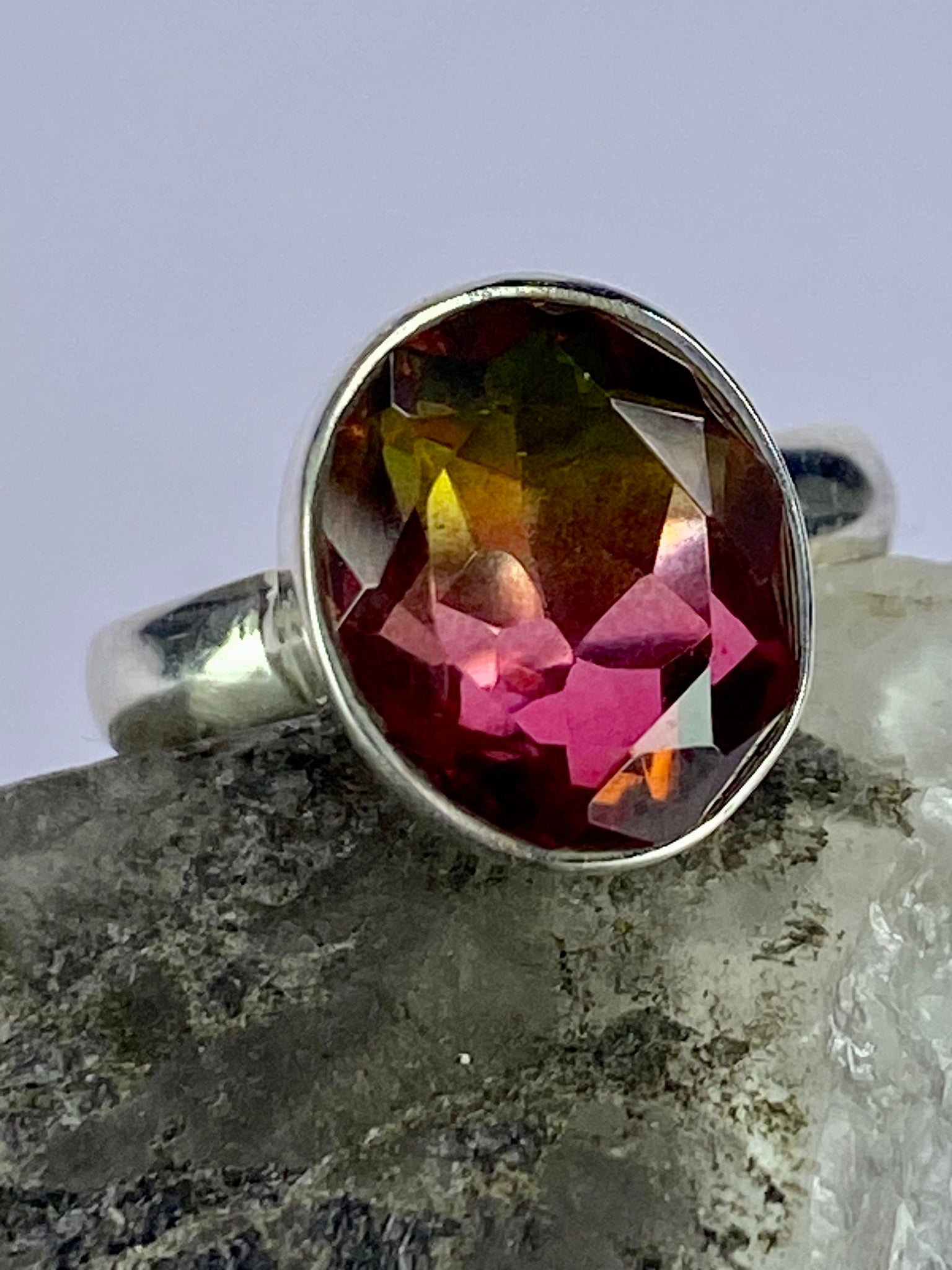A beautiful three colour Watermelon Tourmaline sterling silver ring. The colours are Red, Green and Yellow.