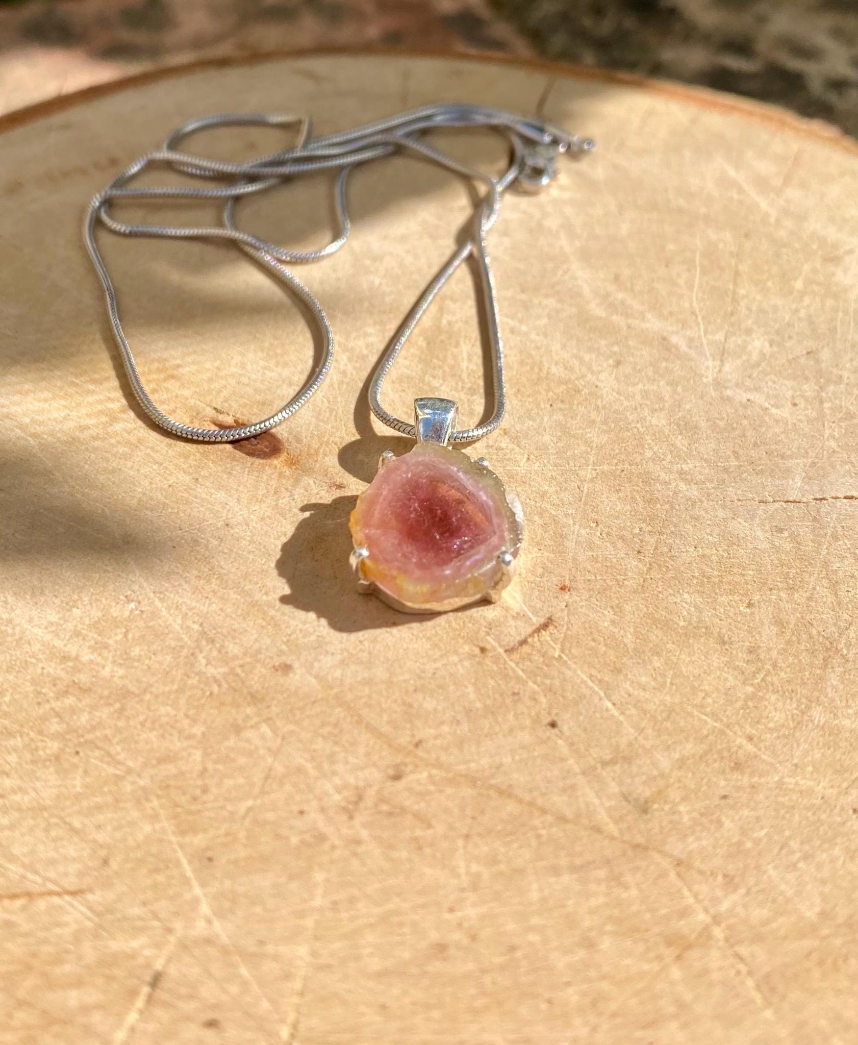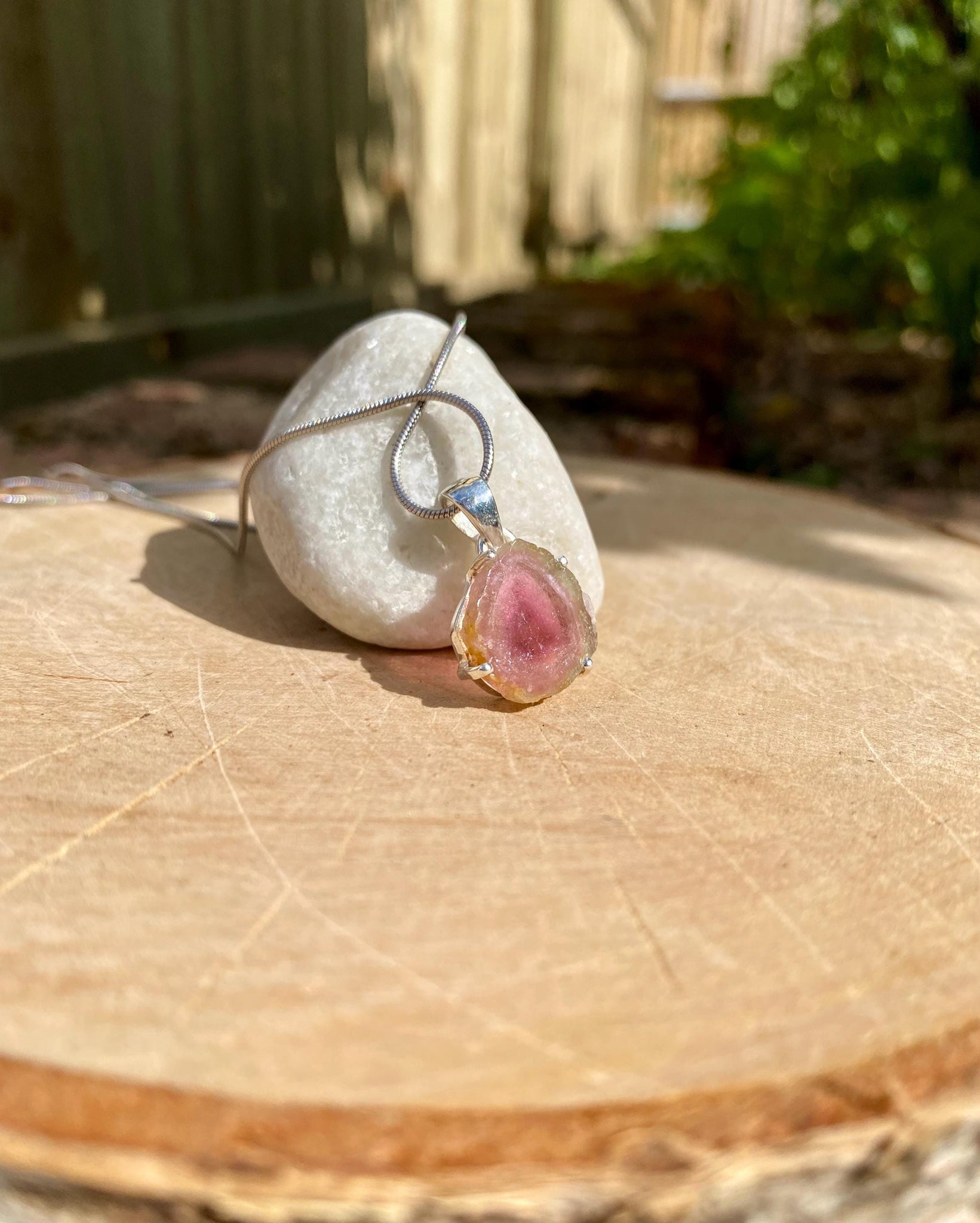 Watermelon Tourmaline Slice and Solid Silver Pendant